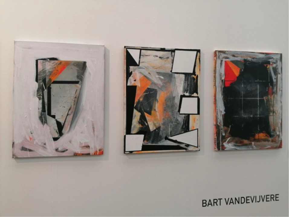 Sofie Van den Bussche showed a selection of abstract paintings by Bart Vandevijvere. His canvases are like arenas in which frictions between geometry and lyricism, harmony and disharmony, delay and dynamics come together in an interactive game. His paintings are the surprising results of visual experiments in different places on the canvas. In terms of composition, the works sometimes resemble collages and as a whole they produce a spatial effect. In an illusionary way, Bart Vandevijvere breaks through the static character of painting (free from a text by Benedict Vandaele).