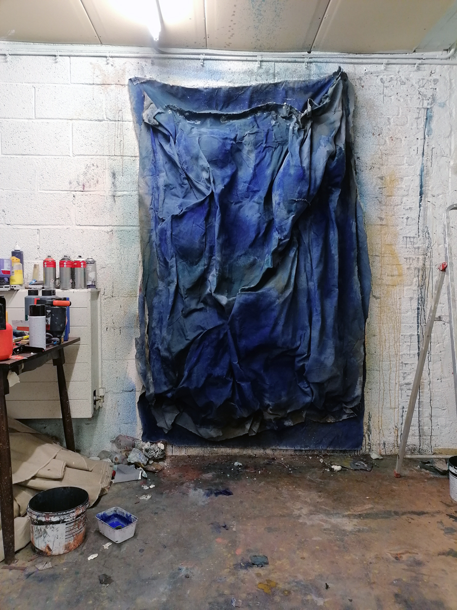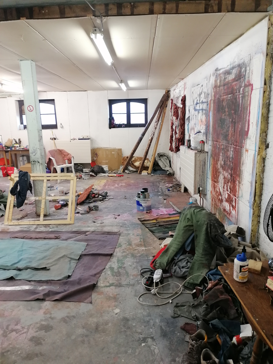 Dat is het niet voor mij. Het is iets subliems. Mijn atelier ziet er chaotisch uit, maar voor mij is het totaal niet chaotisch. Ik werk graag op de vloer, daarom liggen mijn materialen, doeken en eigenlijk alles op de vloer. Ik kan altijd alles vinden, alles ligt binnen handbereik. Ik vind het de mooiste plek die ik ooit heb gehad. Het is mijn favoriete plek op aarde.