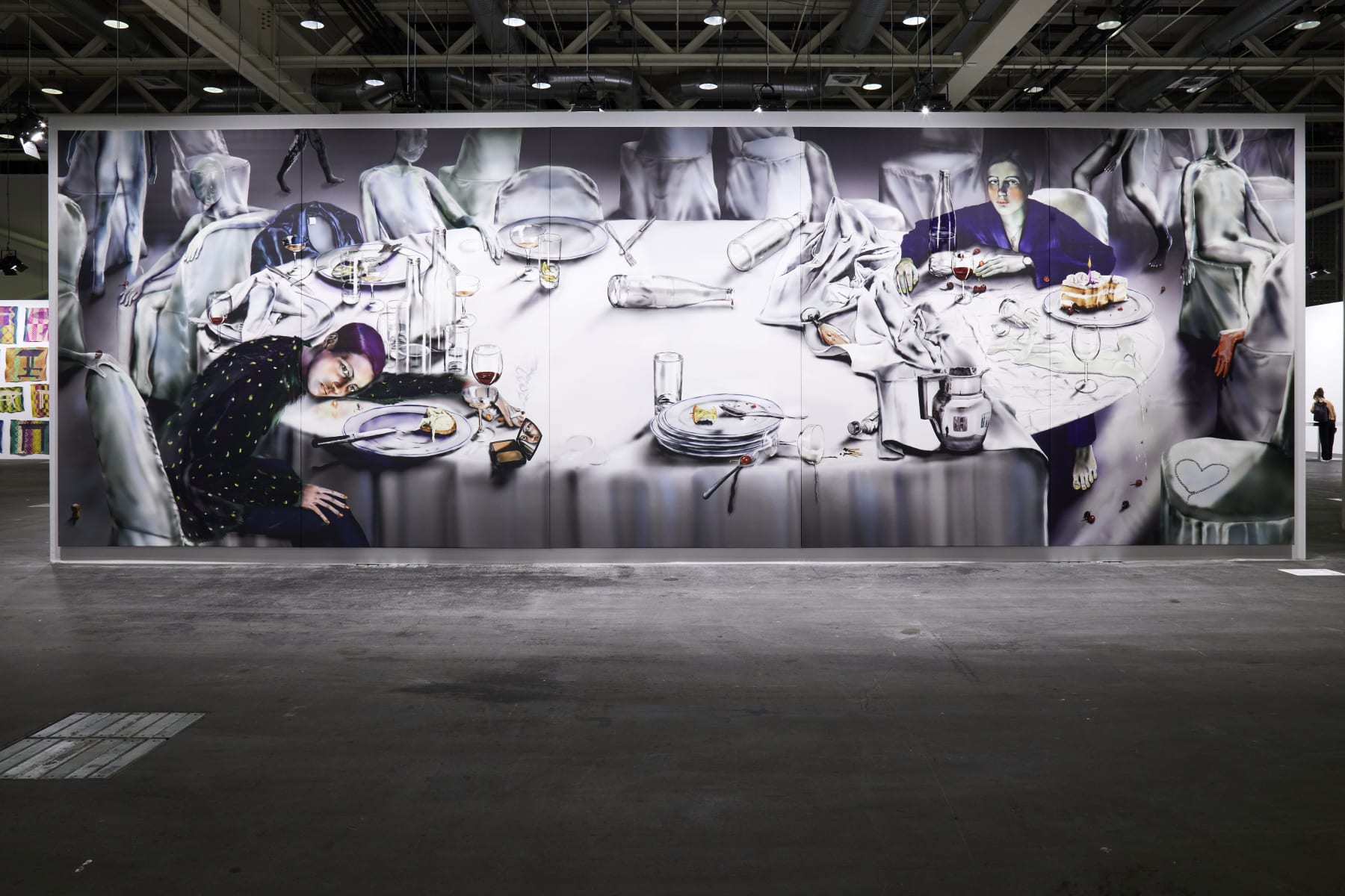 Earlier this year, the Swiss artist presented a large-scale work in the prestigious Unlimited section of Art Basel, which she created especially for the occasion. In Tête-à-Tête (11 x 3.7 metres) we see two women leaning on a round table so large that the existential scene seems to be taking place at a wedding. The whole thing looks chaotic, the people are drunk and isolated, the glasses have fallen over, the plates are empty and stacked in an untidy way. If you stand closer, you see elements that are not quite right: a naked body on a half-eaten sandwich, the memory of a face in the wine, ghostly apparitions, the reflection of a gallery wall in a silver jug. Is this a reflection of the gallery space in which we might view this painting? The artist describes her work as the thing you see when you open a random door, places that might look peaceful or where something has just happened — or is about to happen.