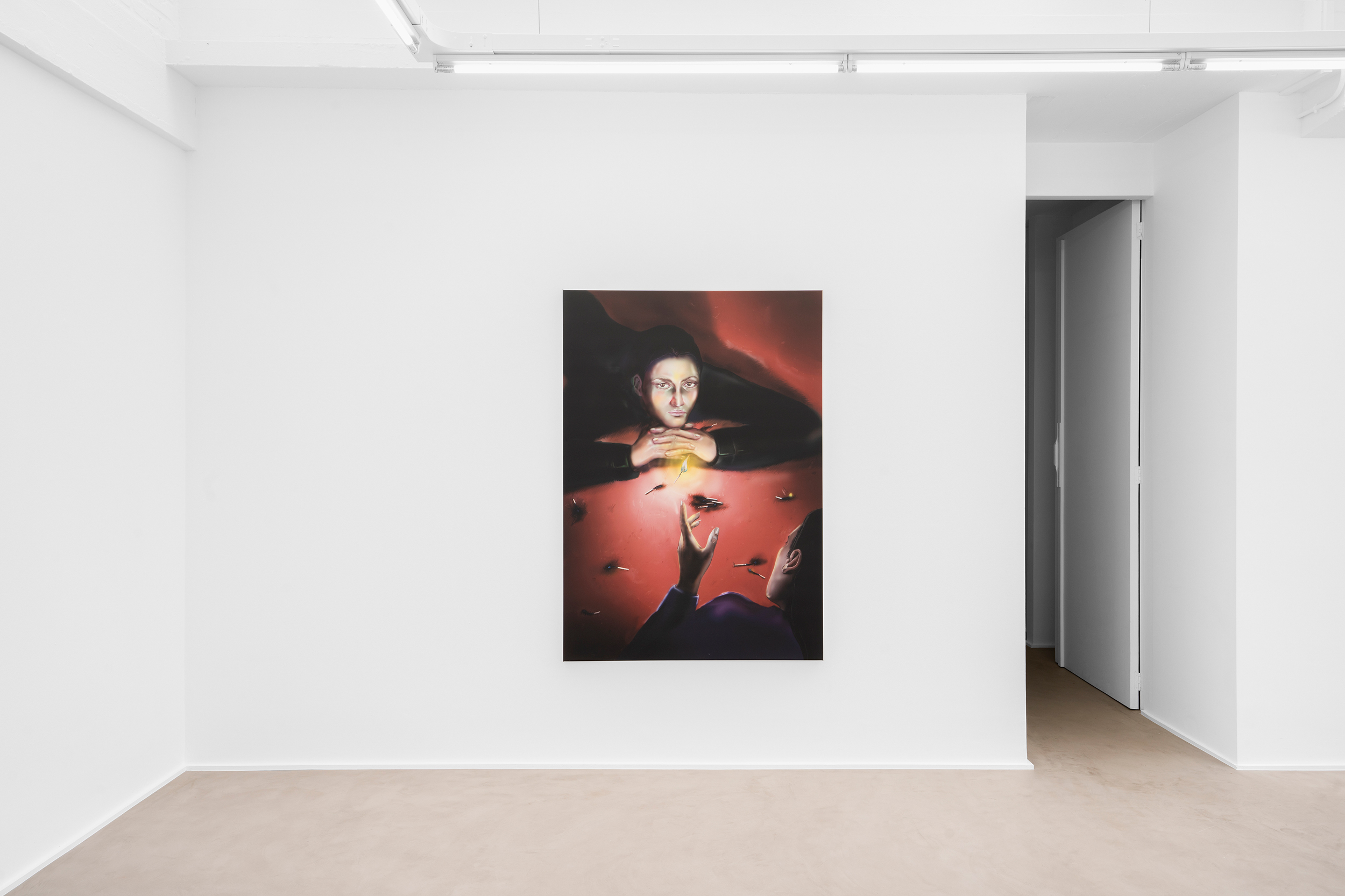 rodolphe janssen presents a series of large works by the artist that are as mysterious as they are surreal. A woman in a bath who doesn't look directly into the mirror, but is nevertheless gazed at by her reflection. Two shadowy characters kissing in the steam of two pans on the fire. Two people in a tent of sorts, having a conversation in the light of a floating, burning match.