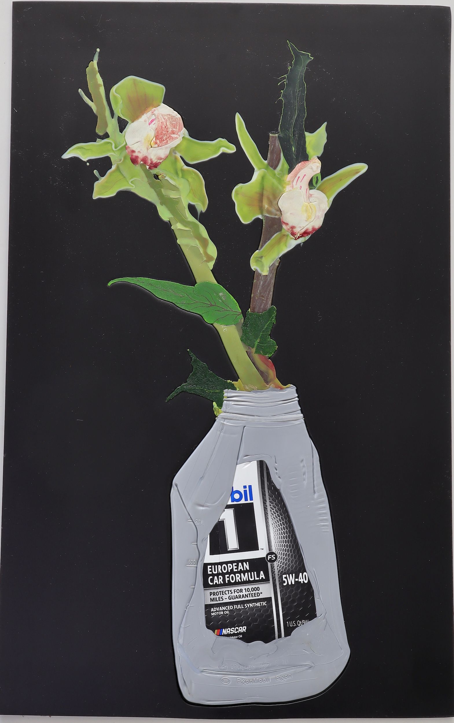 In the exhibition at Frank Taal Galerie, Shanabrook shows his latest series "Trash Flowers", for which he extracted materials from waste containers in Russia and America. The background of the works is made up of found sintra, a material that is often used for advertising photographs, supplemented with the remains of silk flowers after the silk has been removed. The depicted flowers are in stark contrast to the dark reality that lies behind the ways in which we deal with waste — and by extension: the planet and the global south.