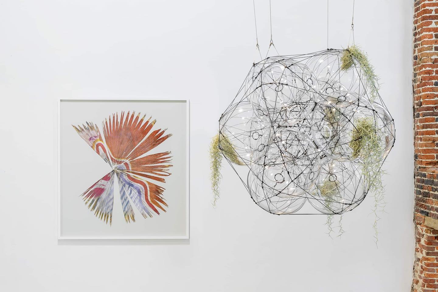 Diezelfde vegetatieve aanwezigheid vind je terug in de werken Pneuma 150 en Ibytu 7.47 HM van de Argentijnse kunstenaar Tomás Saraceno. Dat we ons met deze kunstenaar in illuster gezelschap bevinden, bewijst het feit dat zijn werk momenteel ook te bewonderen is in de Londense Serpentine Gallery. Handgeblazen glazen bollen in een net polyester lijken doorheen de ruimte te zweven. Sommigen bestaan gedeeltelijk uit spiegelglas waardoor je op een moment naar jezelf kijkt die naar zichzelf kijkt in de reflectie van het geheel. Uit sommige van de bollen hangen grassen, ze steken bleek af naast het felrode koraal. Hier is net het omgekeerde aan de gang: de natuur neemt een deel terug van de menselijke interventie. Mensen die vertrouwd zijn met het werk van Saraceno kunnen ook genieten van twee subtiele spinnenwebwerken waarmee hij ooit tijdens een tentoonstelling in Palais de Tokyo mijn eeuwige bewondering oogstte: spin en kunstenaar als extravagant artistiek duo.