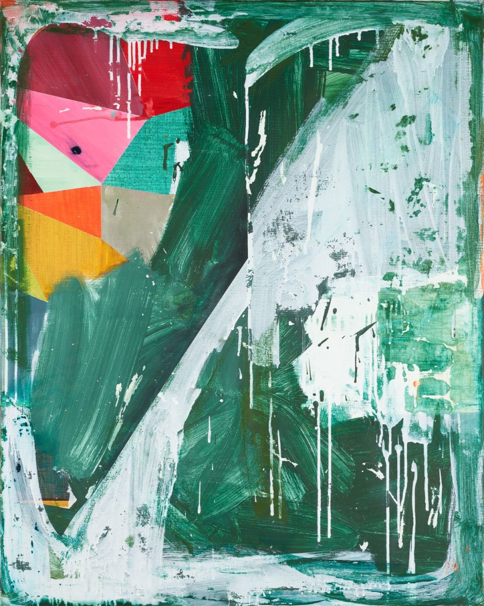 You make abstract compositions, often using multiple techniques – clean taped surfaces interspersed with grid patterns and seemingly wild brushstrokes – so that as a viewer, you sometimes think you are looking at a collage. How did you come up with this visual language?