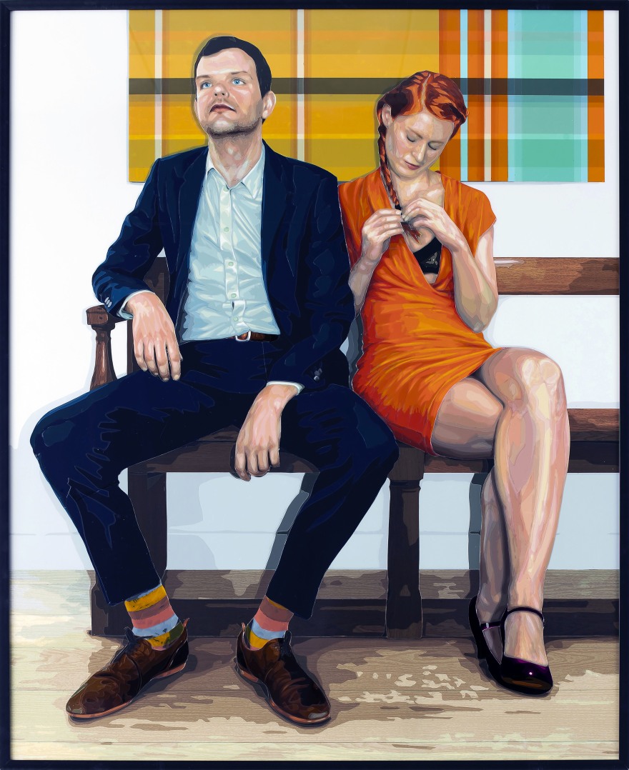 This question is irrelevant to me. In the figurative work, I want to focus on formality, but in the sense of etiquette. After all, the people depicted in Woestenborghs' oeuvre do not stand out because of their refined posture or clothing; at first glance, the lady on the exhibition poster could easily be the daughter of Cameron Diaz and a young Madonna (the pop star): rebellious, provocative, even a bit mischievously erotic. She does not look the viewer in the eye. She averts her gaze, but holds our attention by sticking out her tongue. It is not offensive, but has a certain erotic tension. She covers her naked bosom with her hands while giving us the middle finger, a gesture that almost threatens to get lost in the image because the red-painted fingernails barely contrast with the coloured glitter on her body. The space in which the woman is standing cannot be defined, but the geometric background is reminiscent of the bathroom tiles from the middle of the last century. Another example shows us a tattooed girl sitting on the counter of a kitchen that seems to have escaped from the mind of Mondriaan or Van Doesburg. Again, we see playful innocence, an averted gaze and covered nudity against a geometric background.