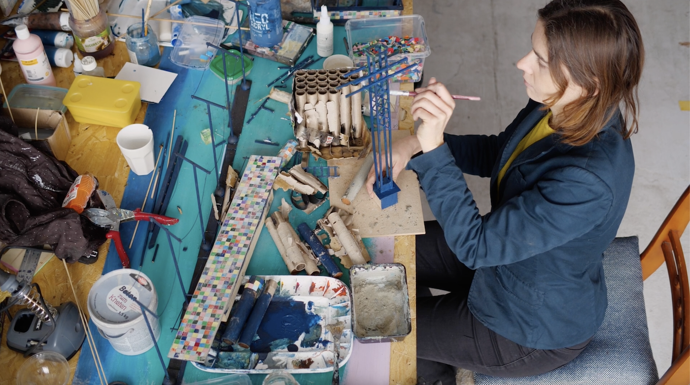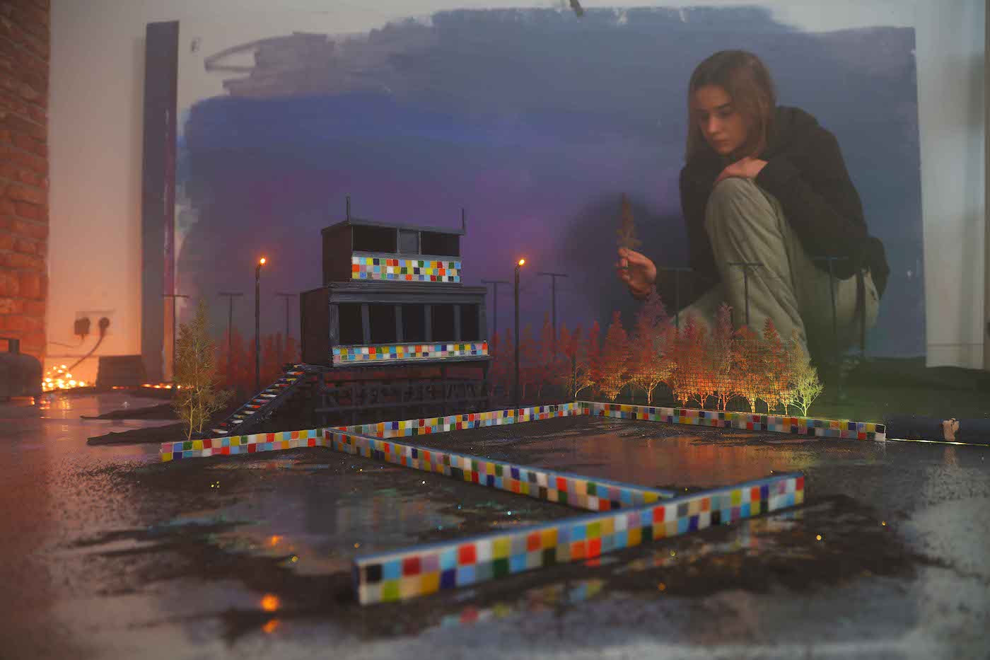 Once I have a rough idea about what I want to create, I start collecting materials and building objects to use in my landscapes. This involves weeks of working with stirring sticks, acrylic paint, quick cement, small LED lights, pieces of cardboard and a glue gun. After collecting everything, I then paint several skies and backgrounds on large panels and create a solid foundation for the scene I want to build.