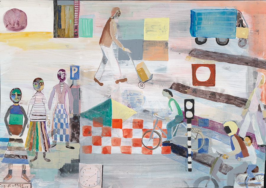 Jantien Jongsma (1965) recently completed the project Back to the Future about Slotervaart, one of Amsterdam Nieuw West's suburbs built according to the Modernist ideals of light, air and space. In her drawings for the project, Jongsma focused initially on the greenery and birds of the parks, followed by the architecture. The neighbourhood residents eventually became the subject of her work. “I view the identical movements of people on the street as an ingenious choreography of shoppers, delivery workers and cyclists,” she explains. Jongsma links this choreography to another Modernist movement, Futurism, which also focused on costumes and stage design. In works like Winkels Plein Straat Staat Verkeer, the figures in futuristic attire adopt theatrical poses.