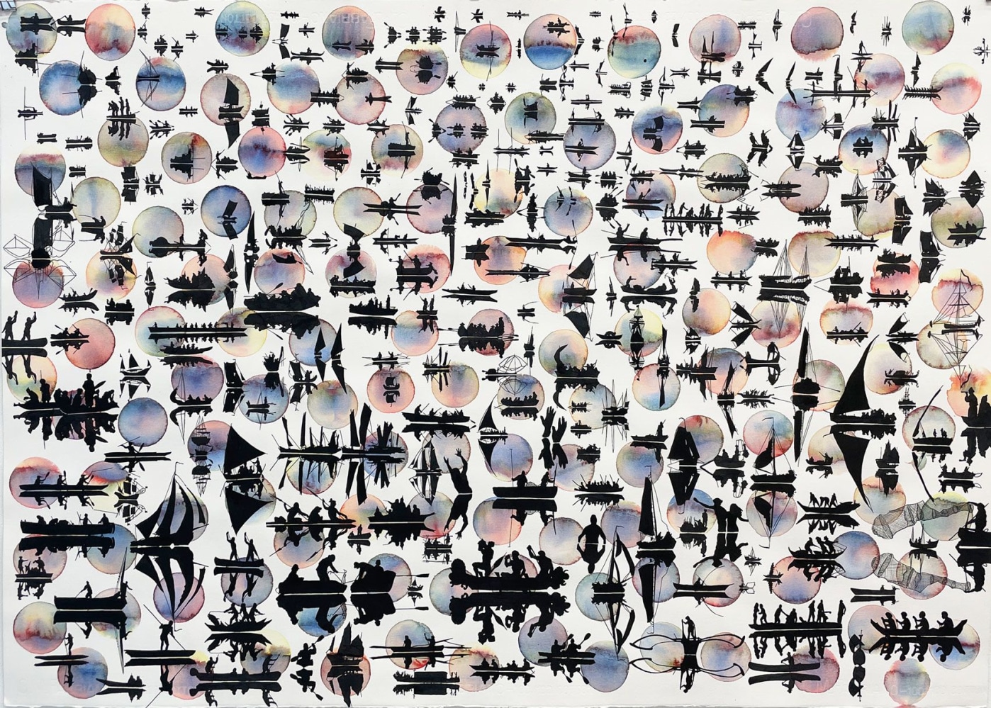 Prepare to embark on a nautical journey is the title of the booklet accompanying his recent series of work and it aptly reflects the essence. Much of his work features boats and dinghies of all shapes and sizes, executed in black ink with crews paddling, casting fishing lines or hoisting sails, and always with a perfect mirror image. In other words, there are no choppy waters, only calm sea.