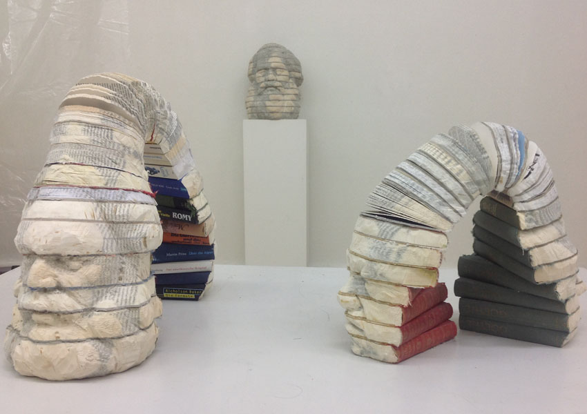Long-Bin Chen, a contemporary Taiwanese sculptor, shows a striking installation of carved books. His sculptures are visually rich with historical and cultural references — such as Einstein or Buddha — and he frequently uses old books for his pieces.