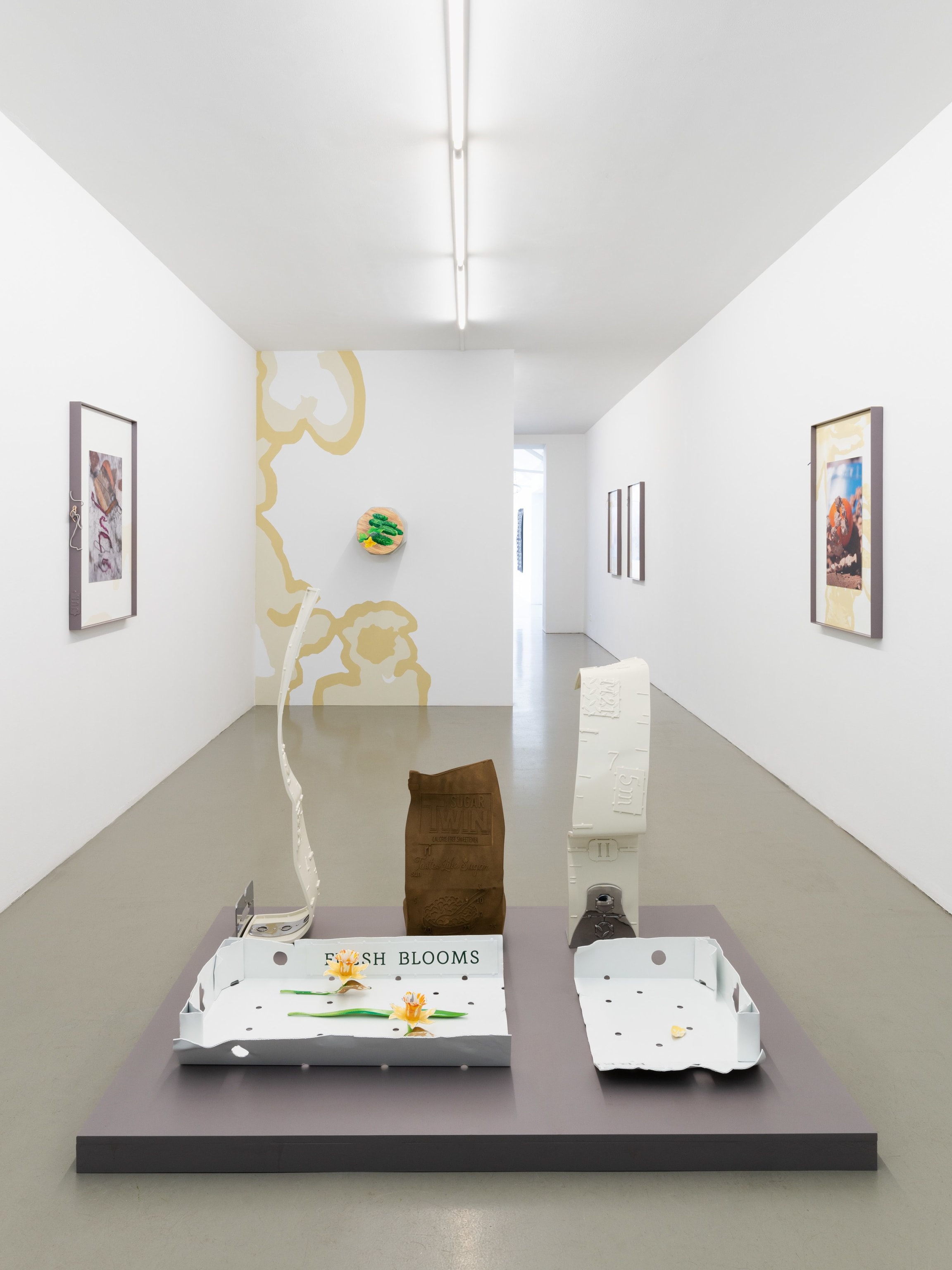In the back space, work by Tenant of Culture (pseudonym of Hendrickje Schimmel) is on display. She creates objects and installations using discarded, leftover or unsold clothing as her primary source material. Through collage and (de)construction, she aims to establish the conditions for an inclusive understanding of cultural production, where labour and craft, waste and raw materials, calculated aging and sustainability all come together.