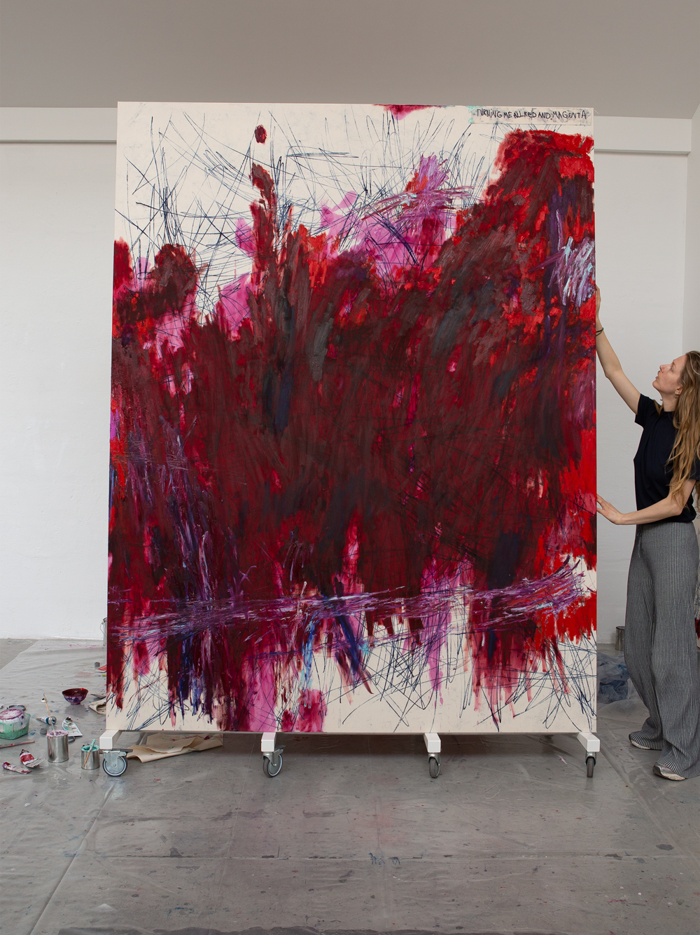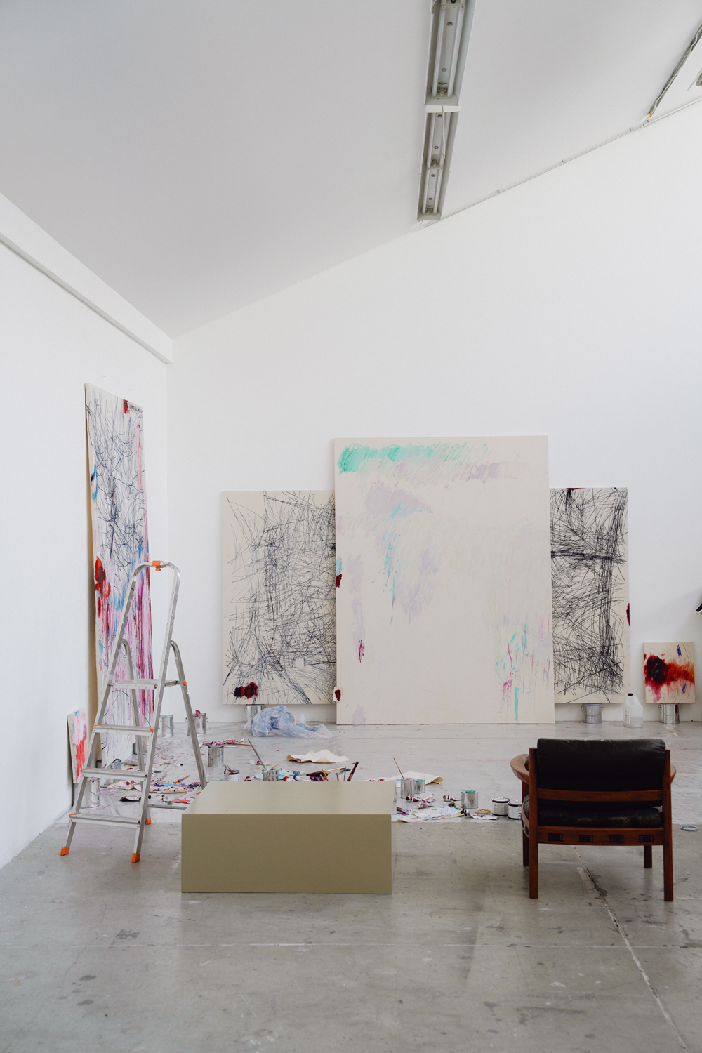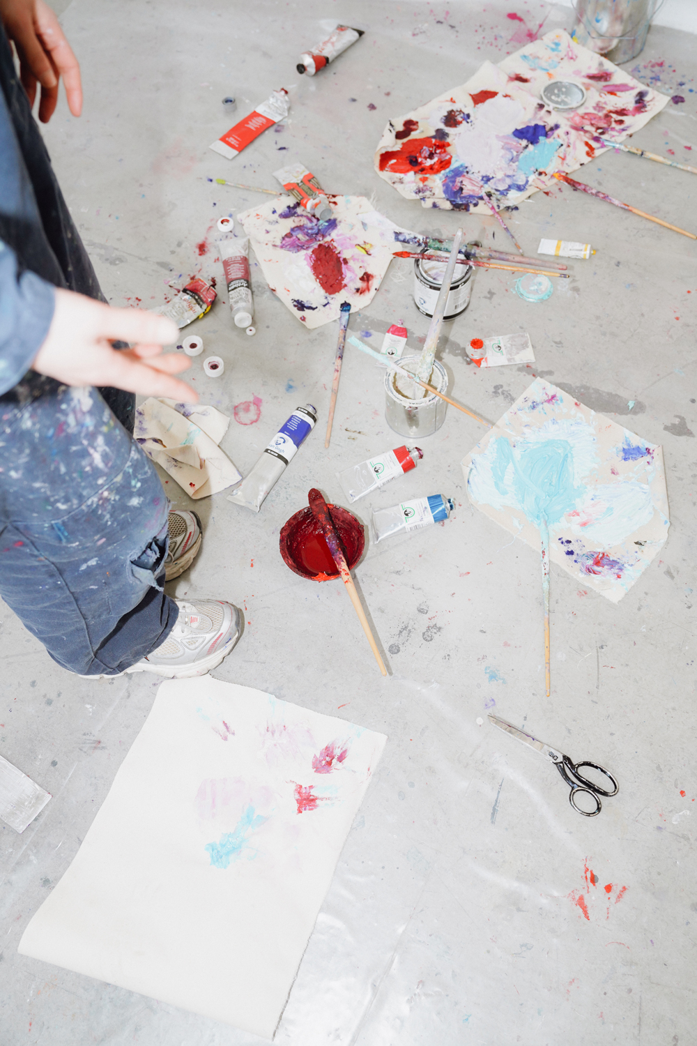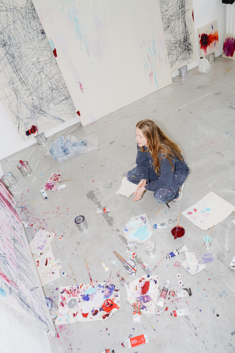 My mornings start with yoga and meditation, which is already part of my workday. I find it important to check in with myself and my body to see how things are going. The goal is to be in the studio by around 10 a.m. Early in the morning, my creativity flows less, so I'm more practical then. I use this time to answer emails, order materials, etc. I'm always surprised by how much time that takes. I prefer to get all those things done before I start painting, so my head is free of to-do lists. In reality, I’m more flexible and these things overlap more. I try to work until around 6 p.m. If there's a deadline that requires a lot of work, that’s a different story and I can easily work 12 hours a day. And sometimes I don't feel like stopping and stay longer. This is a rough sketch of what my days look like; every day is about seeing what needs to be done.