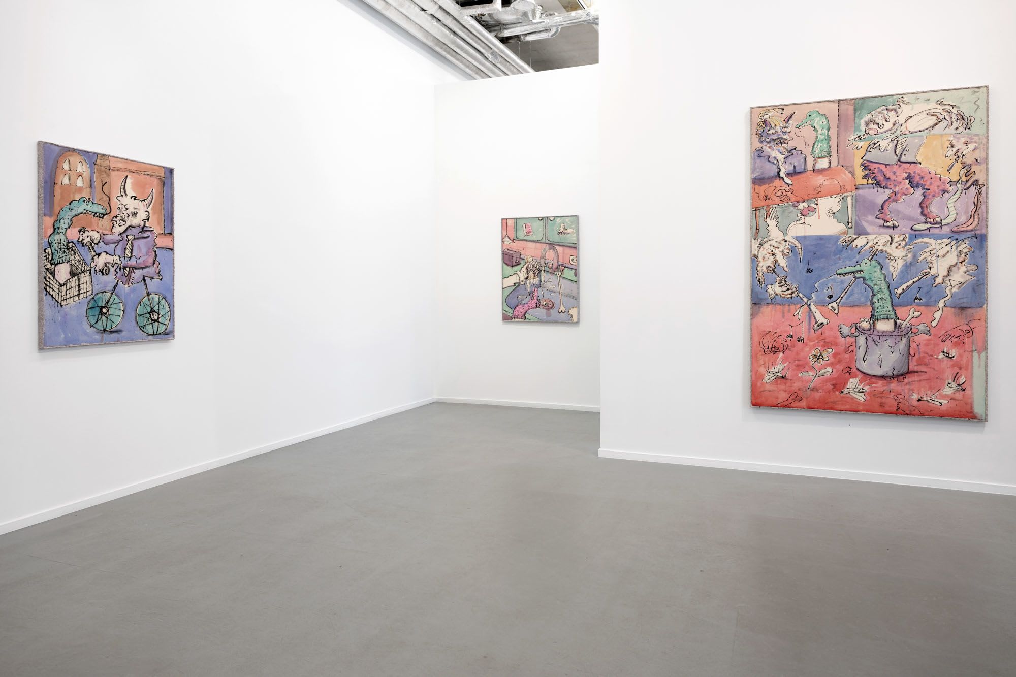 Lutgens primarily showcases paintings, though he’s a draughtsman at heart, with subtle hints pointing to his love for the medium. His canvases are framed with paper-mâché borders and he creates line drawings on transparently primed canvases.