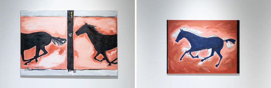 Surrounding the wagon are paintings of galloping horses, inspired by Muybridge’s groundbreaking motion studies. Muybridge was the first to capture movement in a sequence of images, a milestone in the history of film and photography. For Aaron, these paintings build on the themes of the wagon, reflecting on what it means to be in motion.