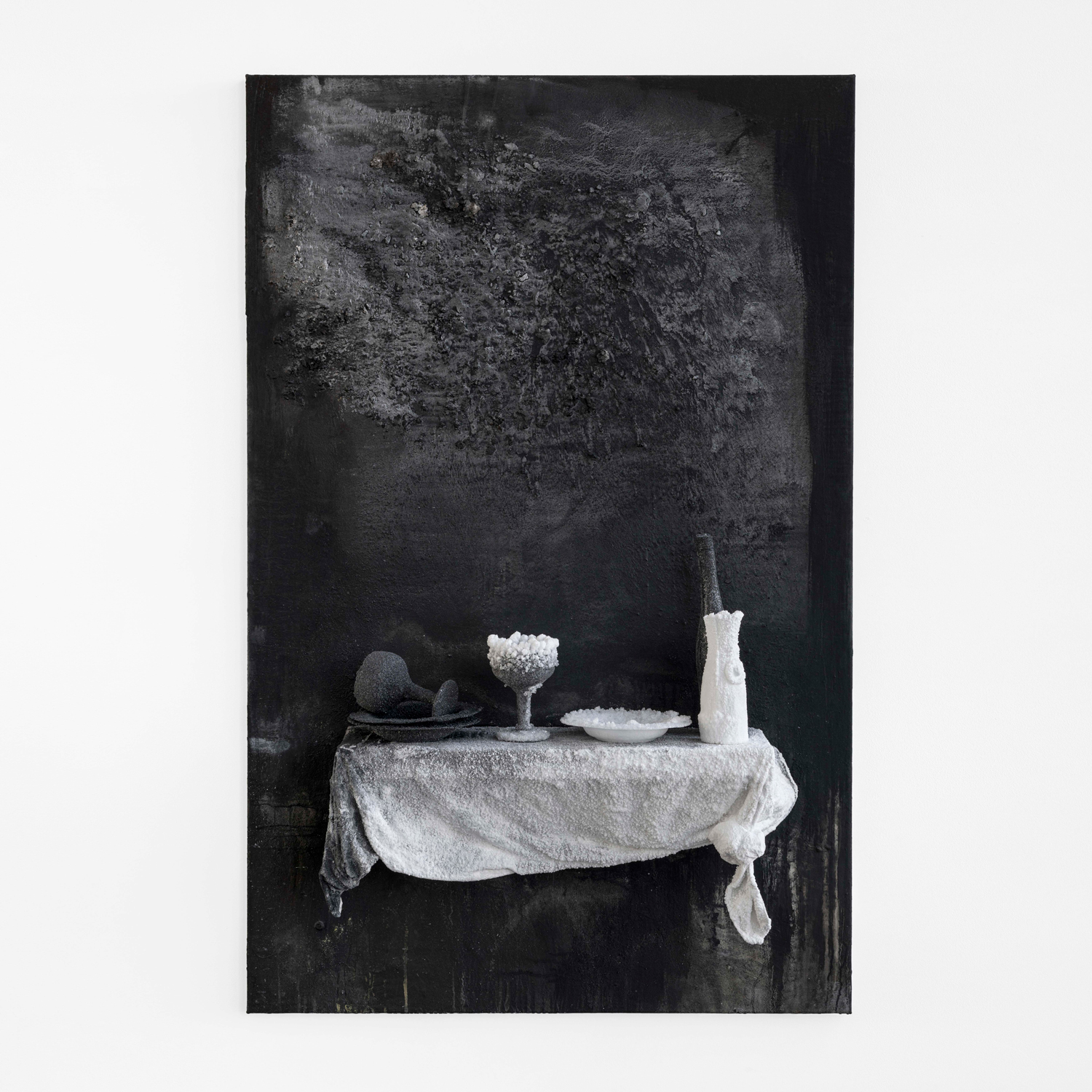 De Vries is known on the one hand for his paintings in which he fixes pure pigments onto canvas, and on the other for works made entirely of salt — a material that was initially difficult to stabilise but offered endless possibilities once he succeeded in doing so. He has created large panels with it, as well as sculptures of tables, plates, glasses, and cutlery.