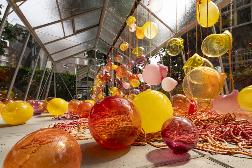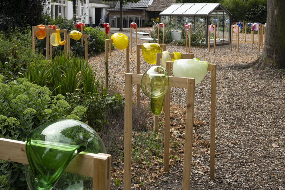 In 'Inflatable Thoughts', the museum itself becomes a living organism. In the galleries, stairwell, entrance, garden and café, visitors encounter sculptural installations composed of glass bubbles, characterised by transparency, distortion and fragility. New works appear alongside older pieces, with each location subtly influencing the viewer’s experience of the work.