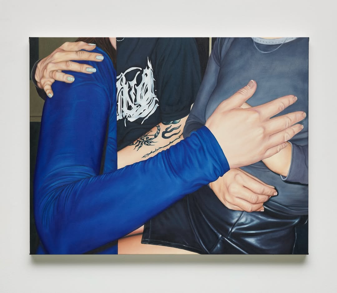 At the same time, individual identity, normally such a defining factor within social groups, plays a minor role here. It dissolves into the fragmentary nature of her compositions. Essers deliberately focuses on details rather than faces, leaving ambiguous to whom those details belong: a glint of hair, fingers resting on a shoulder, the fold of a trouser. Skin, fabric and jewellery are rendered with remarkable precision, yet they remain part of a larger whole. By rarely showing faces, Essers shifts attention to body language, gesture and touch, where emotions reveal themselves far more subtly than in a smile. She conveys the natural intimacy between people who fully trust one another. For a short moment, the viewer becomes a part of this network of friendship and connection. Her canvases show how identity and physicality resist being confined to a single form or label, just like people.
