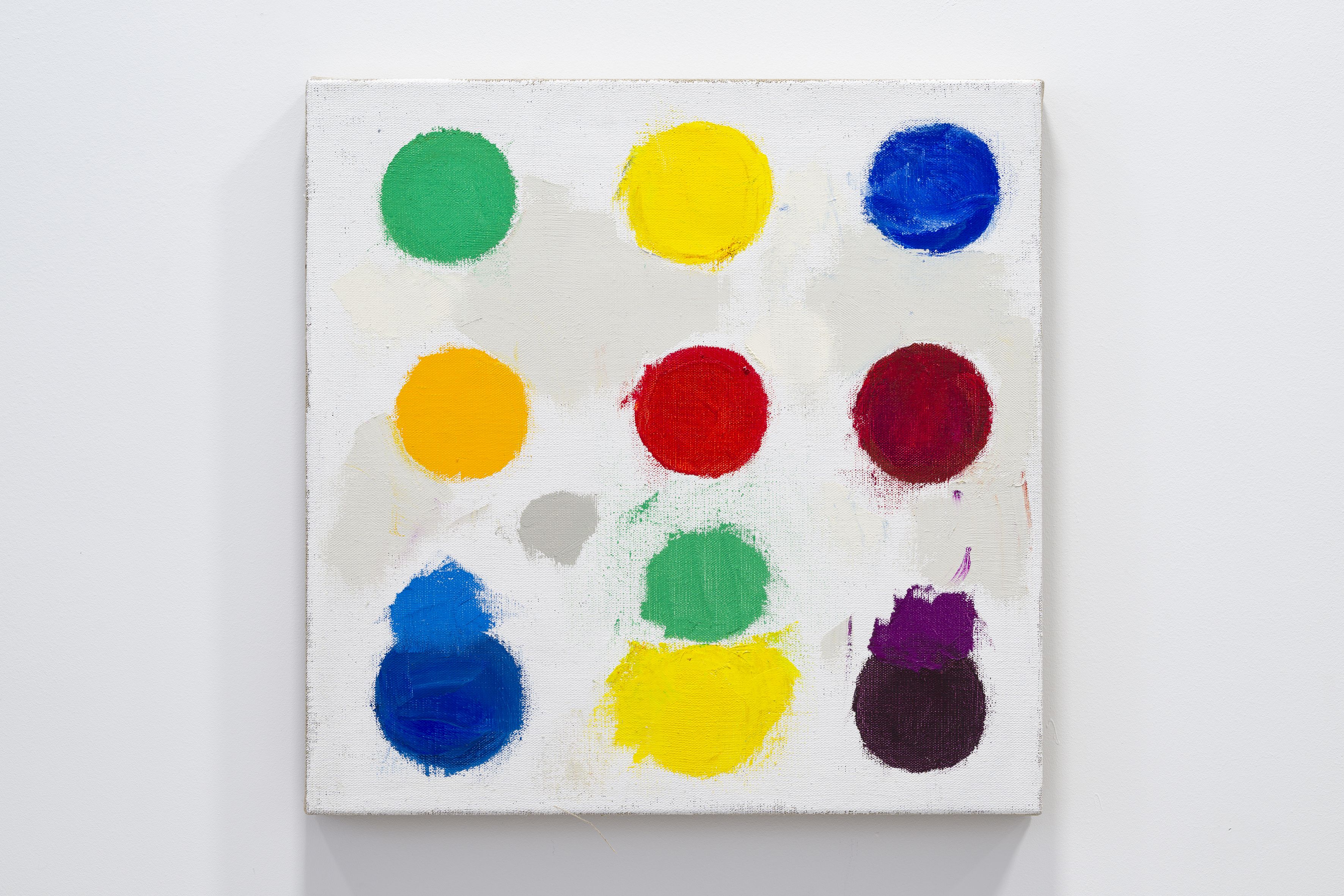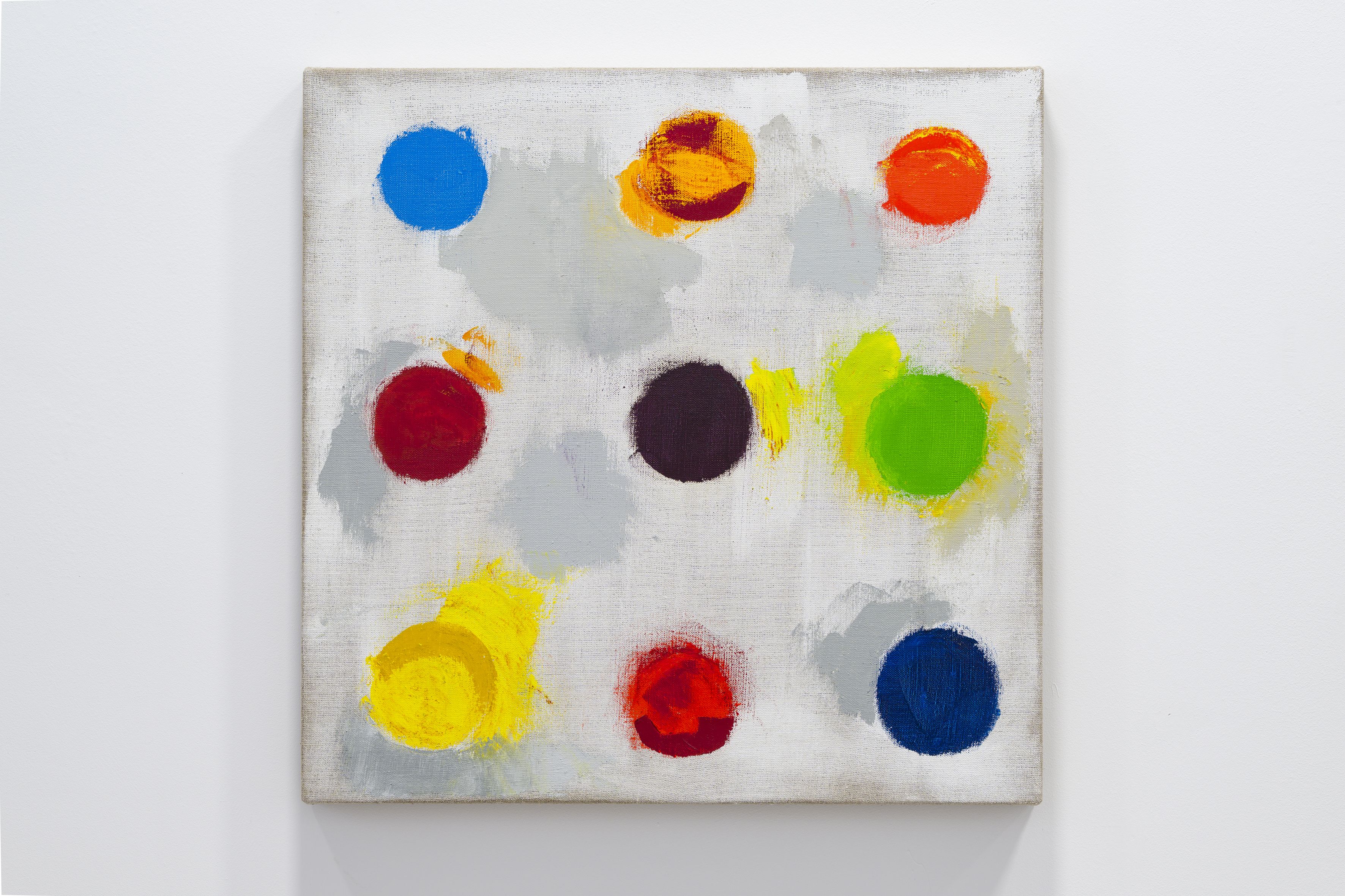 The canvases in the exhibition feel alive: rows and clusters move, probe and test. They are not concerned with order but with friction. Each colour sets off collisions that subtly shift the rhythm as you look. At times, the works approach a grid, at others they resemble a loose sequence of gestures with variations in pressure. Colours may bleed, appear as isolated accents or, in some works, be applied without adhering to the circular form at all. Bright hues such as lemon yellow, cobalt blue and emerald green appear alongside deeper bordeaux and violet. The circles function as points of reference, and by maintaining a single basic form, the emphasis shifts to what actually changes: position, colour, distance and the tension with the background.