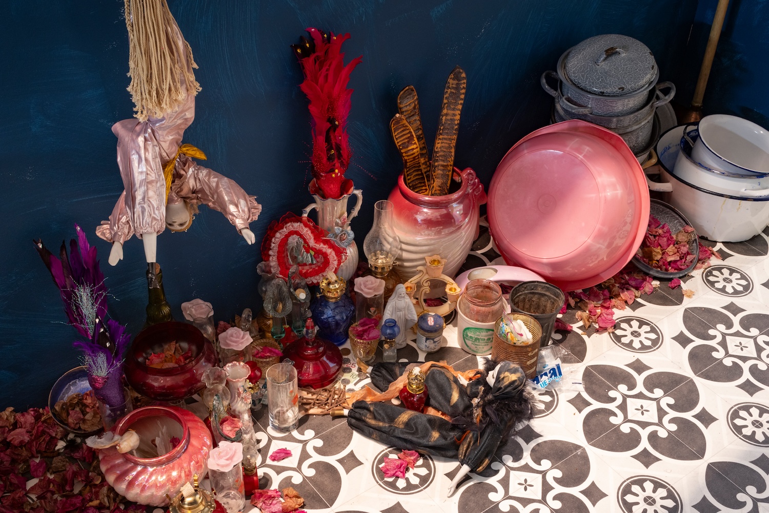 The installation unfolds as a total experience in which film, objects, textiles and handmade figures come together to form a new reality. Domestic materials acquire symbolic meaning, while recognisable elements are interwoven with images and codes that resist immediate interpretation. The space invites visitors to look, feel and move along, without imposing a single, fixed reading. Osepa previously stated in an interview with Unseen: "I often incorporate symbols in my work that resonate with people from the Afro-Caribbean community. I abstract it and place it in a new context. I use these symbols as a means to communicate in a more intuitive way than literature, for example, can. The highest compliment for me is when someone from the island, without any background in art, says they feel something when they look at my work. That way, art can be a form of healing, because people can see a part of themselves reflected in it."