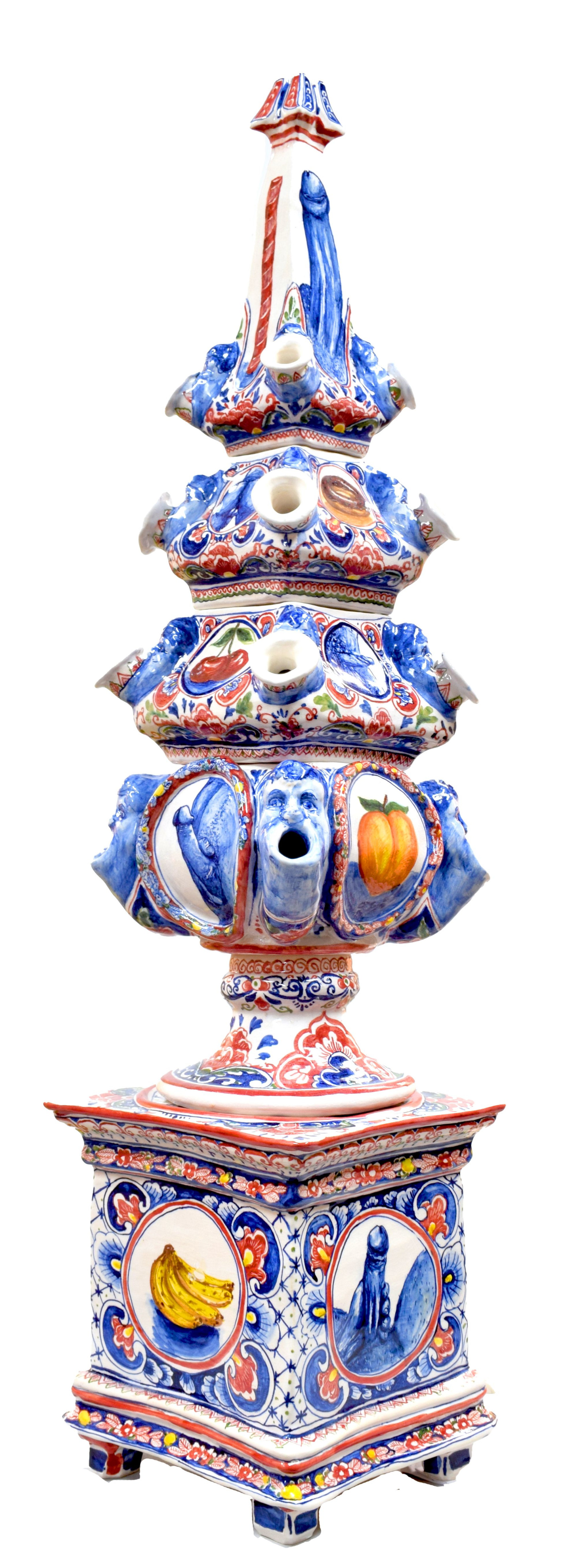 Rademakers Gallery presents a solo show highlighting the work of Chris Rijk. An overview of the works on display can be found here. Rijk translates the visual language of traditional ceramic styles such as Delft Blue into outspoken works about identity, queer culture and contemporary desires, often with a generous dose of humour. This results in unexpected imagery, ranging from Walt Disney Zaandam and Lange Jan from the Dutch Efteling theme park to erect penises, emojis, the Nike logo and online chatrooms. His work deliberately brushes up against social norms.
