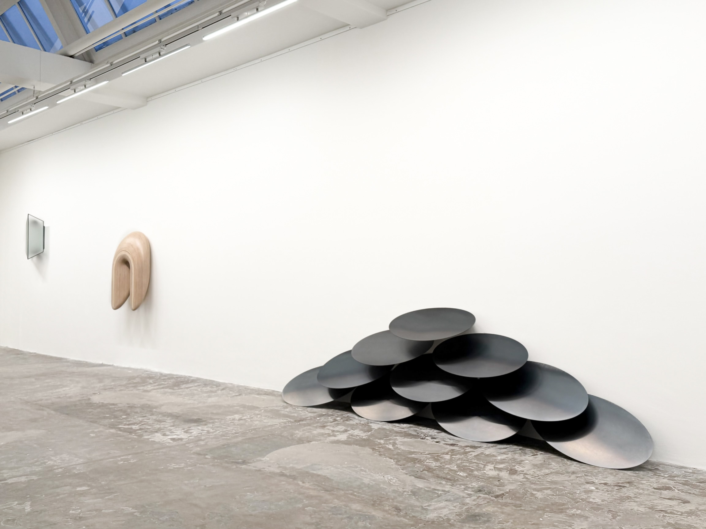 This approach becomes tangible as soon as you experience the exhibition as a visitor. Your perspective on the three-dimensional works changes as you move through the space, and an implicit and explicit tension exists between the works themselves. The sculptures in the exhibition are composed of geometric forms and made from a limited range of materials: black steel, shaped wood and diffuse frosted glass. Almost all of them are placed on the wall or on the floor, which count as elements within the visual experience of the works. Visually, the sculptures refer architecture as well as organic patterns found in nature. In addition, several works on paper are also included in the exhibition.