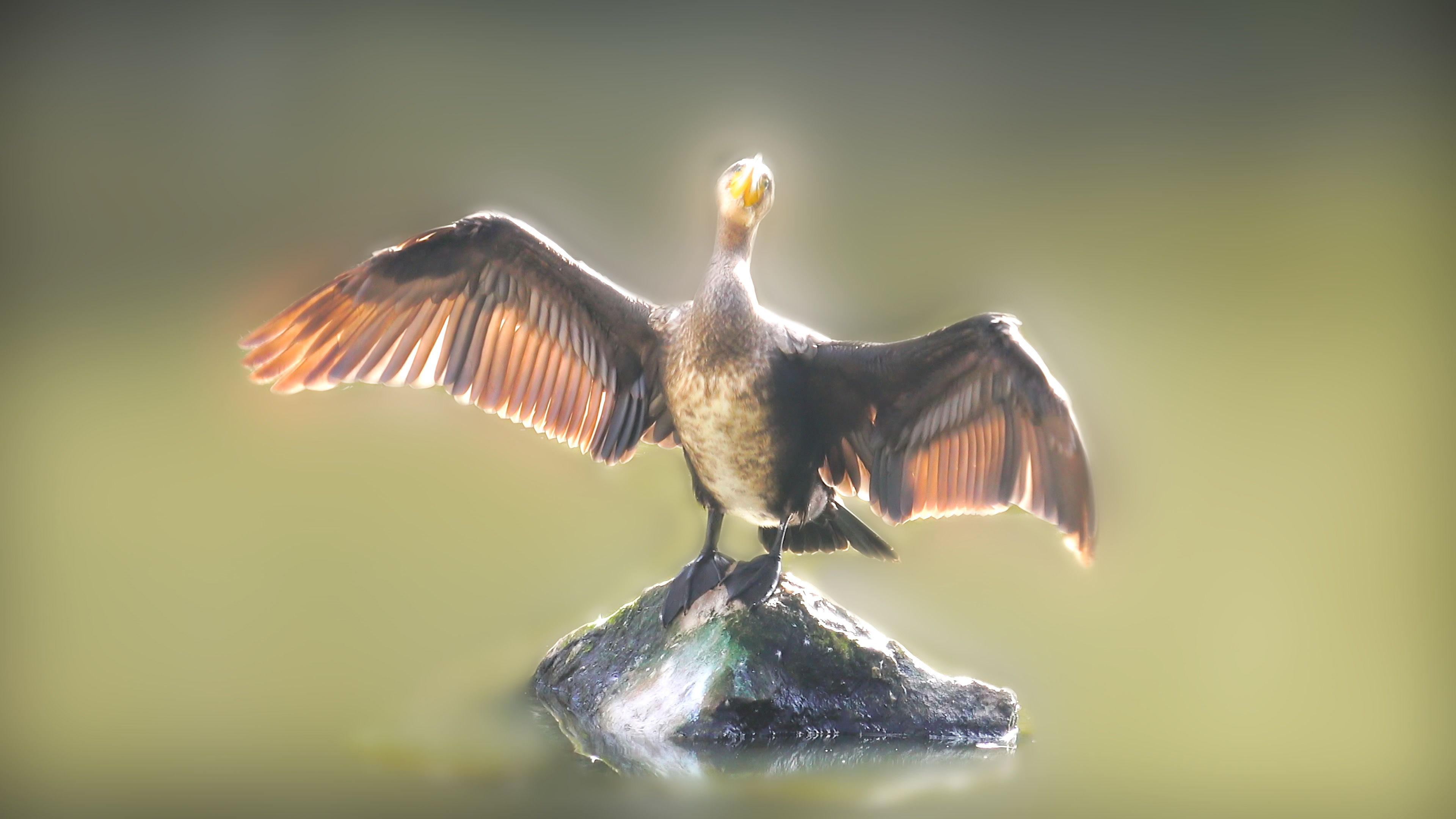 Laaper is interested in rituals, ancient stories and symbolism, as well as in transience, the immaterial and the relationship between humans, nature and time. Nature functions as a carrier of meaning and, by extension, as a mirror or metaphor for human emotions and projections. In the video work "Requiem in Slow Motion" (2025), for instance, we see a vast Indian rhinoceros with a magpie perched on its back. The massive animal scarcely moves and appears vulnerable; only slight movements of the ears signal life. A rhinoceros at life-size or beyond conveys weight, an almost physical presence in the space. When music enters, reminiscent of a requiem, the image acquires an undertone of farewell and loss. In "The Gathering" (2025), two prairie dogs sit beside the unmoving body of a third. It is a concentrated scene in which one of the animals occasionally turns towards us, as if seeking contact. It is difficult not to read universal human emotions into the image. In "Wings" (2025), a cormorant balances on a rock in the water, its wings spread in the sunlight. The surroundings are blurred, allowing the bird to almost detach itself from its context. With its open wings and gently raised head, it's imbued with a sacral element.