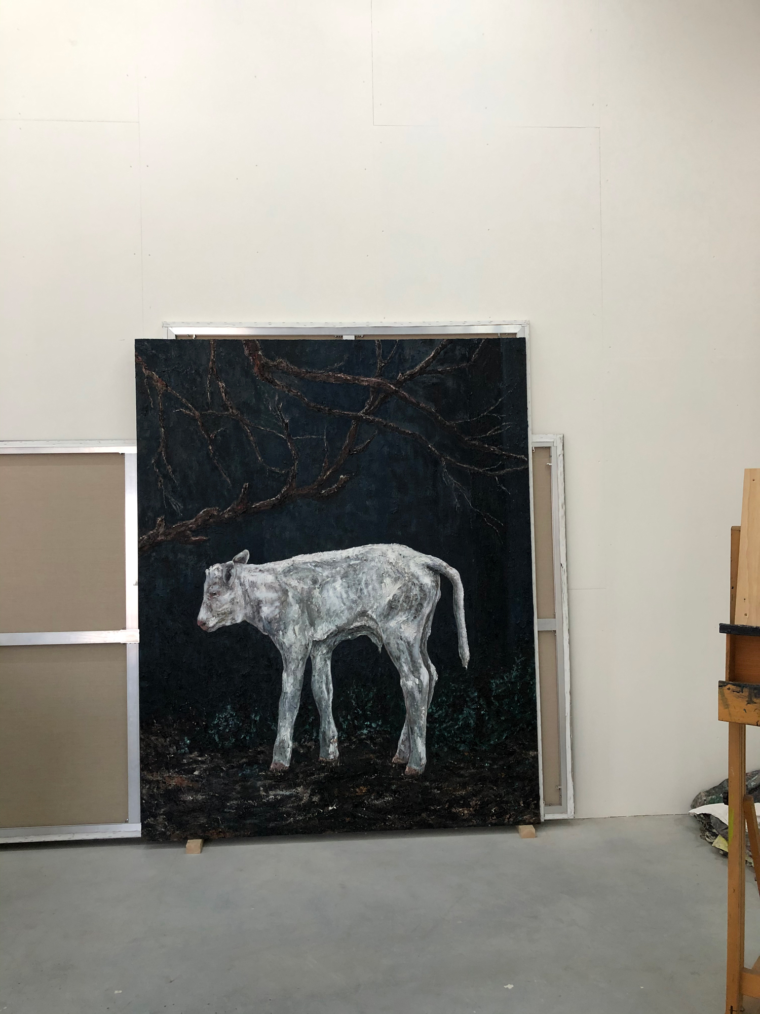 I've always had a fondness for folk art. Those were the first paintings I saw growing up in Twente. Such a representation of a calf or a cow in a stable is typical of that genre. It is a scene that seems from another time, which it is not, but such farms hardly exist anymore. It has a nostalgic longing to it. I know farm life from my childhood, because my grandfather had a small farm and there were farm children in my class. The farm life of that time actually no longer exists. For a long time, I renounced making such canvases, which I used to do more often. It would distract from my main theme, but mentally I cannot process one heavy story of human suffering after another. So, I gave in to painting farm life again, and with great pleasure at that.
