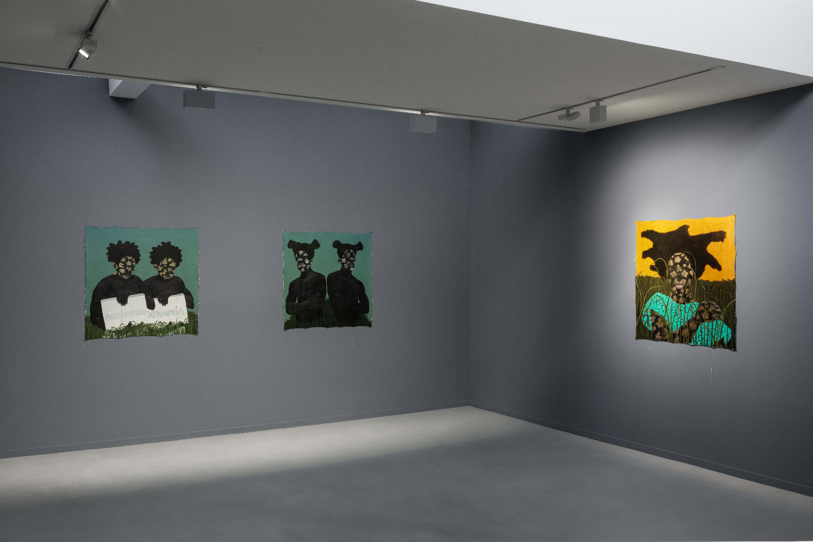 In Galerie Ron Mandos zijn op dit moment twee tentoonstellingen geprogrammeerd. Enerzijds de solotentoonstelling ‘I am here because you were there’ van de Britse kunstenaar Esiri Erheriene-Essi. Vorig jaar was haar werk nog te zien in het Stedelijk, in een tentoonstelling rondom de Prix de Rome prijs, waarvoor ze een nominatie ontving. Erheriene-Essi richt zich in haar werk op de verhalen die doorgaans níet verteld worden, de vaak alledaagse narratieven die samenhangen met de black experience binnen de Afrikaanse diaspora, maar ook alternatieve geschiedenissen. Daarnaast cureerde Azu Nwagbogu (directeur van de African Artists’ Foundation, een nonprofit uit Lagos in Nigeria) een tentoonstelling met figuratief werk van twee kunstenaars: WonderBuhle (Zuid-Afrika) en Eniwaye Oluwaseyi (Nigeria). Ook zij tonen alledaagse familiegeschiedenis waarin de zwarte indentiteit centraal staat, om juist de eeuwenlange onderdrukking en een diepgeworteld gebrek aan representatie aan de kaak de stellen.