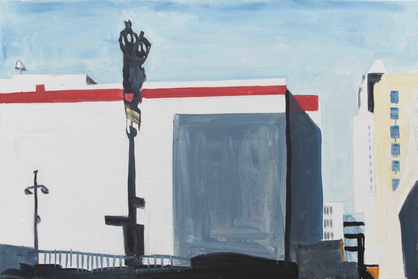 The deserted landscapes and cityscapes in his paintings are the result of a process of abstraction, based on large quantities of photos — sometimes as many as four thousand per trip. Van den Broek's practice is aimed at translating these photos into an analytical, stripped-down and painted image. In his studio in Belgium, the artist uses these photos as a starting point for his paintings, that balance on the boundary between abstraction and realism. They are often executed in a characteristic colour palette. Van den Broek: “I started translating the photos I took in America in Belgium, where things are always gray and depressing. That way, it becomes a truly autonomous image, for which I focus on composition, light and atmosphere. I am fascinated by spatiality, in its relation with human beings. A person needs freedom, but also requires and prefers a safe state of being.”