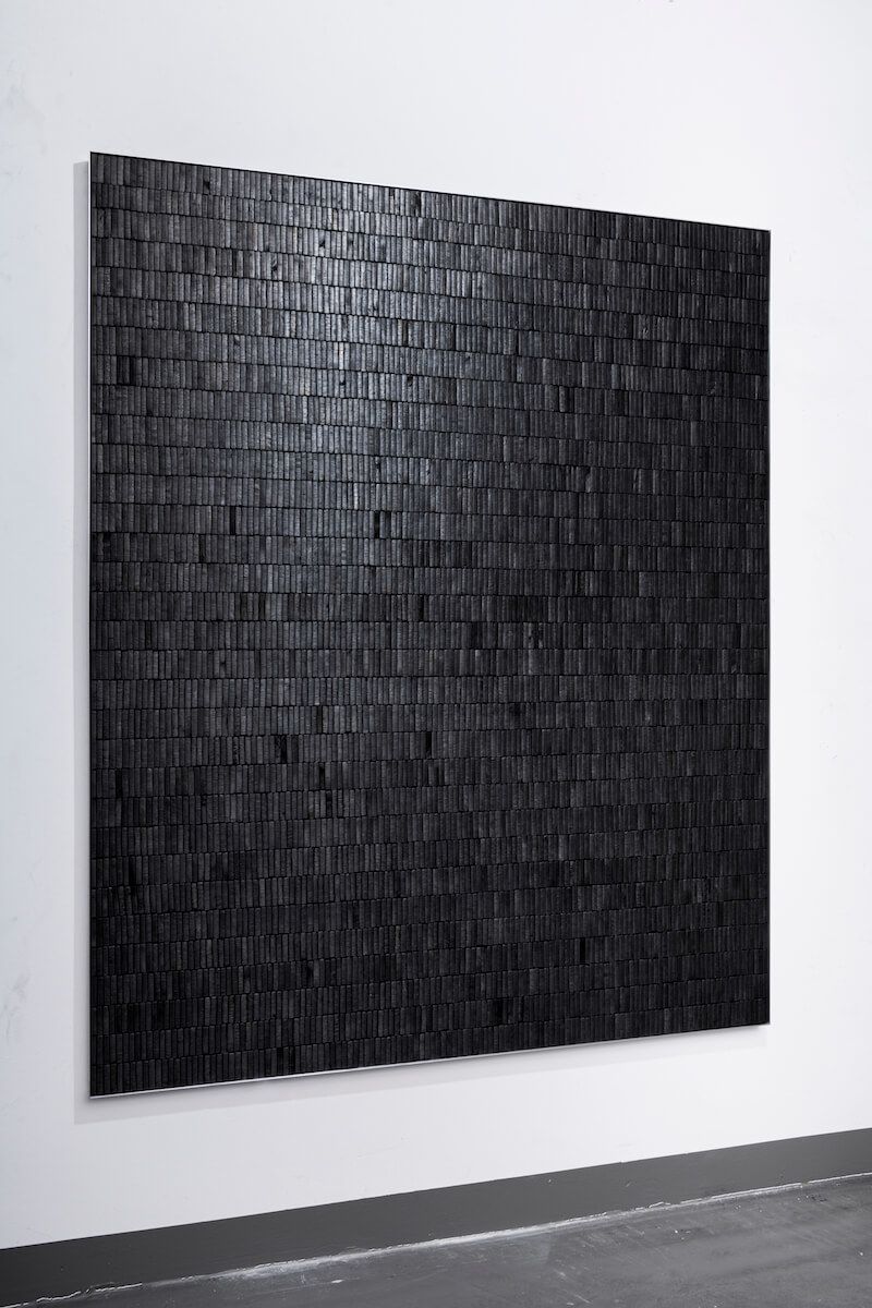 Face to face with a work by Julia Schewalie, the amount of craftsmanship and attention to detail immediately catches the eye. For her larger geometric patterns, she uses hundreds, if not thousands, of custom-made pieces of black material. Materials that reflect, such as vinyl records or computer discs in Disk Black. She sorts, arranges and cuts them until they are almost unrecognizable and do not recall their original function.