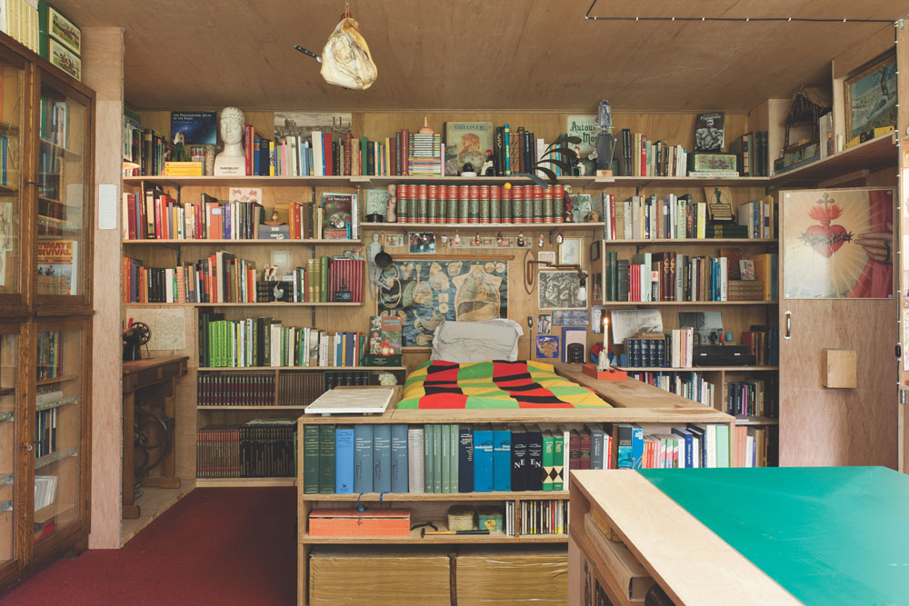 Zoals ik al zei: een tafel, een stoel en een paar boeken. Ik ben geen materieel persoon, ik heb ook geen opslagplaats. Al mijn werk gaat direct naar Zeno X, het wordt door hun opgehaald en ingekaderd. Dan is mijn huis weer leeg. Zo kan ik overal mijn atelier hebben.