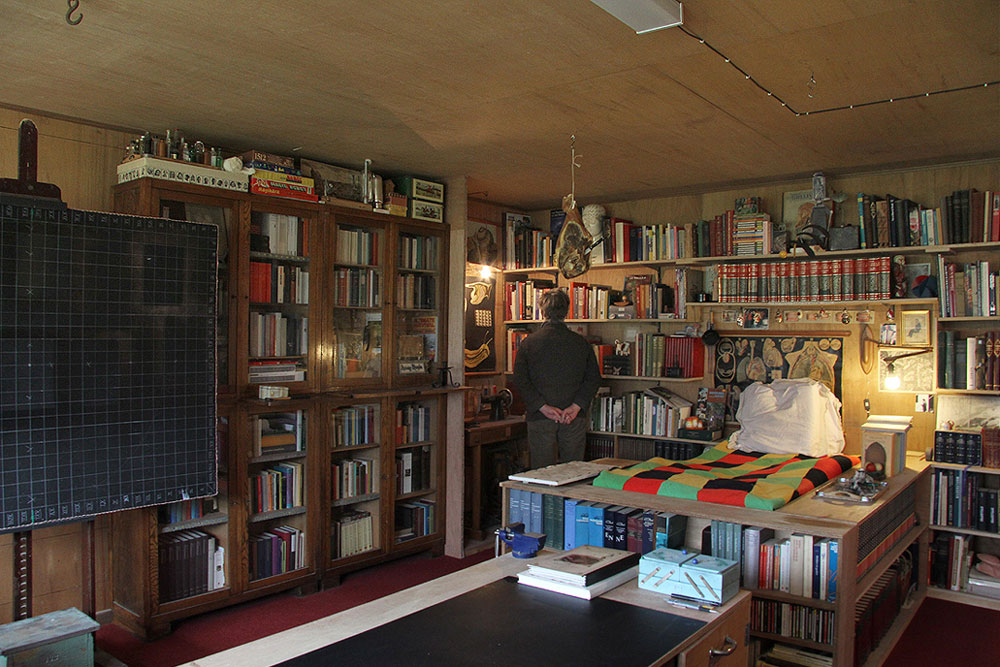 Omdat ik aan huis werk, ga ik nergens naar toe. Ik kan overal werken: op zolder, in een kelder, in elke kamer in het huis. Ik maak er een plek van maar ik heb niet veel nodig: een tafel, een stoel, een paar boeken. De kamer is wel een afgesloten ruimte, het werk dwaalt niet door het hele huis. De plaats waar ik werk is dus niet van invloed op het werk, het is geen voorwaarde om iets te maken.