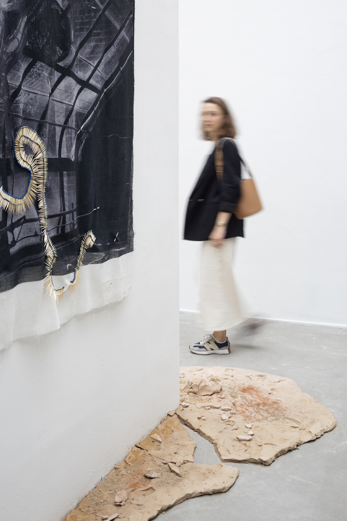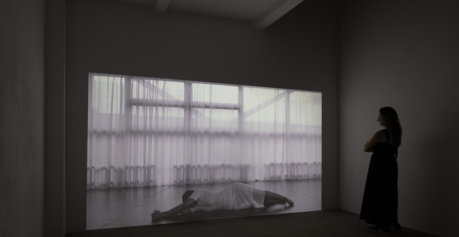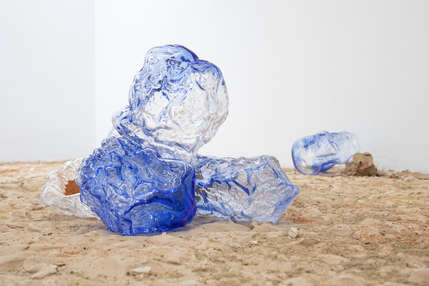 The 'Sleep in Witness' exhibition that is now on display at AKINCI was previously presented in a different form at the Henry Moore Institute in Leeds, until last October. In both exhibitions, part of the floor is covered with cracked clay and sand, carefully shaped by the artist's feet. As a viewer, you are forced to walk over it in order to enter the exhibition, which makes the instability under your feet tangible. In combination with blue structures of transparent, hand-blown glass — reminiscent of rocks or water — they form the site-specific installation "Zinodaka". The video work "Rolling Mountains Dream" in the exhibition refers to remembering and learning from dreams. And the works "Instigation in Waiting I & II" refer to the ways in which colonial oppressors introduced new plant species and removed existing ones as a way of controlling the environment, a tradition that lives on in a different form in conservatories and botanic gardens.