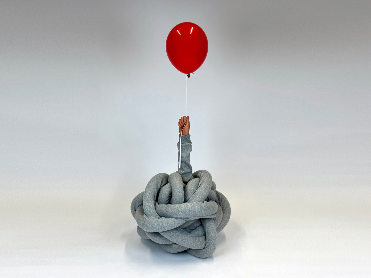 For my sculptures, I often use second-hand clothes and shoes that I’ve worn for years—items marked by use, as silent witnesses of their past. I also make hands and feet, sculpted based on my loved ones. For example, there’s my mother’s hand balancing a rolled-up sleeve of 40 metres and my son Alf’s hand holding a red helium balloon—a universal symbol of loss, vulnerability and hope, inspired by the French film Le Ballon Rouge.