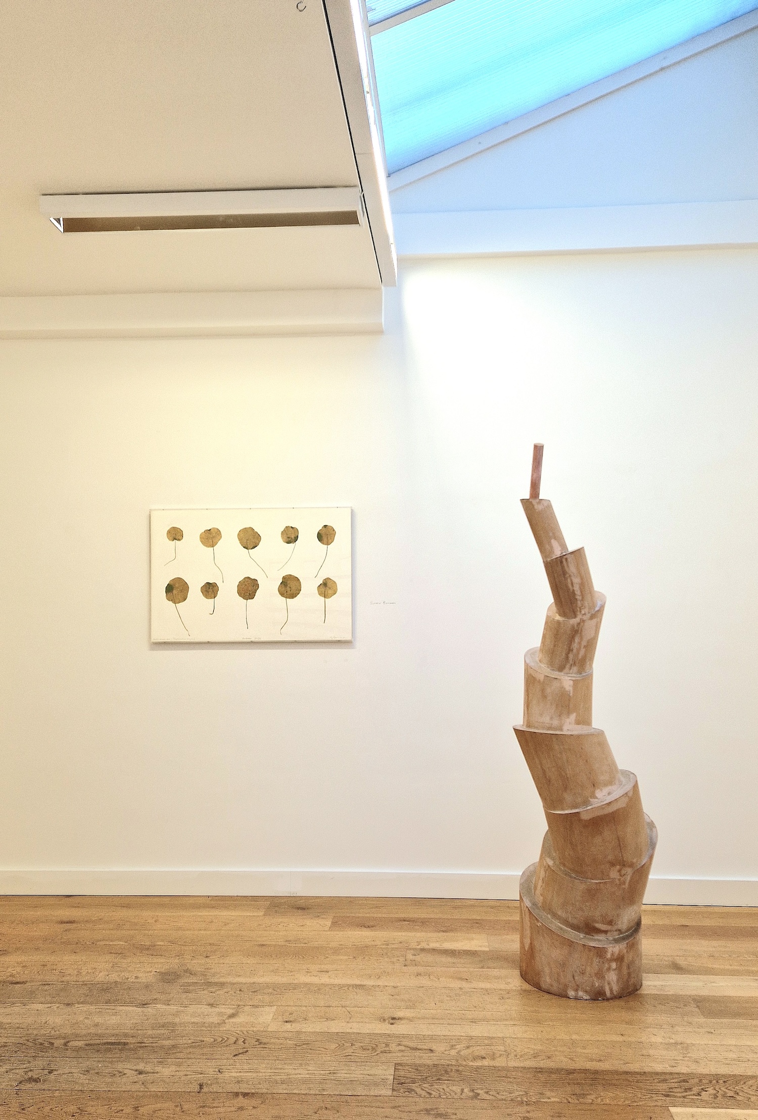 A unique work by François Morellet hangs in the backroom of the gallery. It features four squares, some of whose lines are formed by bent branches. This piece engages in dialogue with work by Sjoerd Buisman from the 1970s and 1990s, displayed in the same room. Like Morellet, Buisman interacts with nature. In one of his oldest works, a dozen leaves are shown. Buisman has replaced the missing parts of the leaves with leaf-green material, though the remaining parts have become copper-coloured.