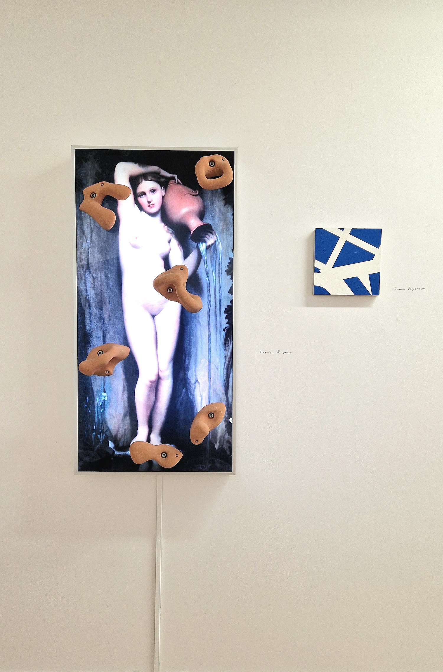 On the back wall of the front room is a black-and-white photograph by John Baldessari of a man and his dog in a kayak, featuring two coloured shapes. One shape resembles a shark fin. Take a step or two back to view Baldessari’s work alongside the back wall of the main room and you will notice that the same shape reappears in Jan Maarten Voskuil’s wall sculpture.