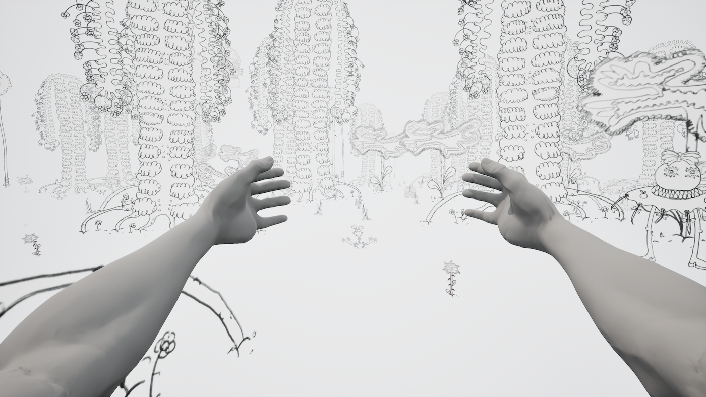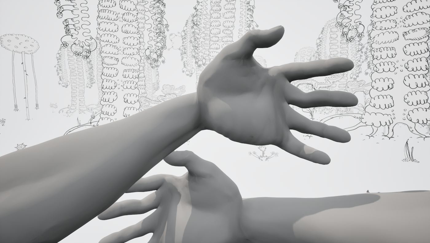 “Ik wilde een game creëren waarin compassie centraal staat. In veel commerciële games draait het om geweld, en dat vind ik op zich niet slecht,” zegt Janne. “Ik ben er ook mee opgegroeid, maar als ik nu hetzelfde zou maken, voegt het niets meer toe. In First Person Hugger bekijk je de wereld niet door een geweerloop, zoals in een traditionele first person shooter, maar door open armen. In plaats van schieten, zijn knuffelen en praten de voornaamste interacties van de speler.”