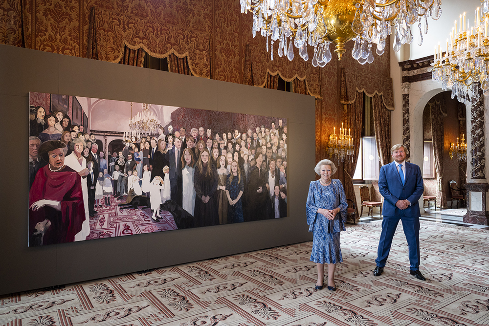 Curator Mirjam Westen calls it a small miracle that all the artists cooperated, because many of them are currently busy with exhibitions that were postponed due to the pandemic. Helen Verhoeven (winner in 2008) even made a completely new work for the impressive Throne Room in three months: The Family. As with the magisterial De Hoge Raad (2015), she brings together a large group on the 4 by 2 metre canvas. Verhoeven mixes fact and fiction and brings the members of the House of Orange together over the centuries in a panoramic family portrait.