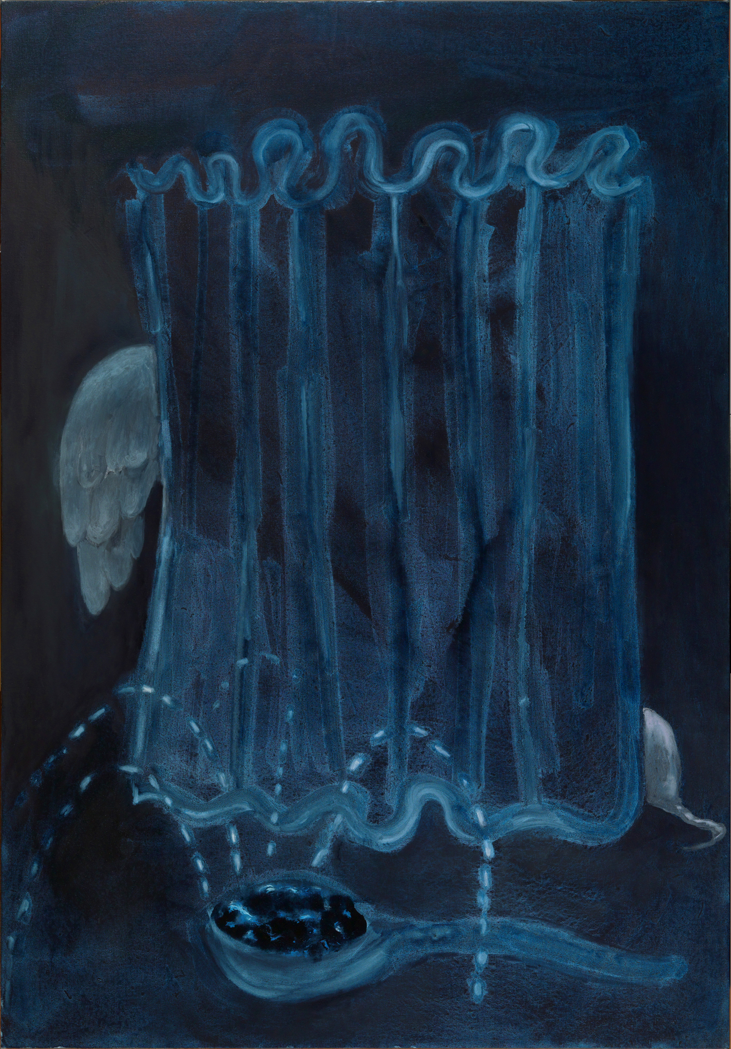 Rinella Alfonso (b. 1997) was born in Curaçao and talks about the 'accidental works of art' one encounters on the island, such as an old plastic chair that slowly decays under a tree due to moss and vegetation. Yet, no one throws the chair away. In fact, someone placed a pile of bricks under it and suddenly a sculpture is created. This playful way of looking is typical of Alfonso: “My best works start with sketches in which I gradually let go of my original preconceived idea, so that an image emerges that is a surprise – even to me. My paintings display an ideal relationship between abstract and figurative art”. You can see that balance in the dark blue tones of the Upward Splash and Peek shower scene.