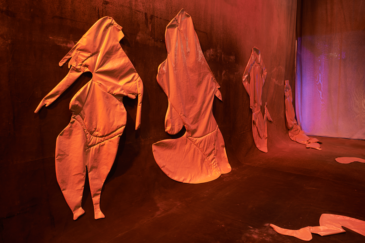 In Sebastiano Blu zijn vrouwen in de menopauze nog achtergrondfiguren. In de volgende ruimte worden ze gepromoveerd tot hoofdonderwerp. The Forest of the Hot Flashes (Het Woud van de Opvliegers) is een wandvullende installatie. De overgang tussen de ruimtes en de verschillende media – van film naar vrouwfiguren uitgevoerd in skaileer en geplaatst in een voormalig theaterdecor – valt nauwelijks op omdat de toonzetting van het werk hetzelfde is. De Puddle Ladies, de vrouwfiguren in skaileer, zijn gebaseerd op houtskooltekeningen die niet in de tentoonstelling zijn opgenomen, maar die je wel hier online kunt zien. De tekeningen zijn met een trefzekere hand in een paar streken neergezet.