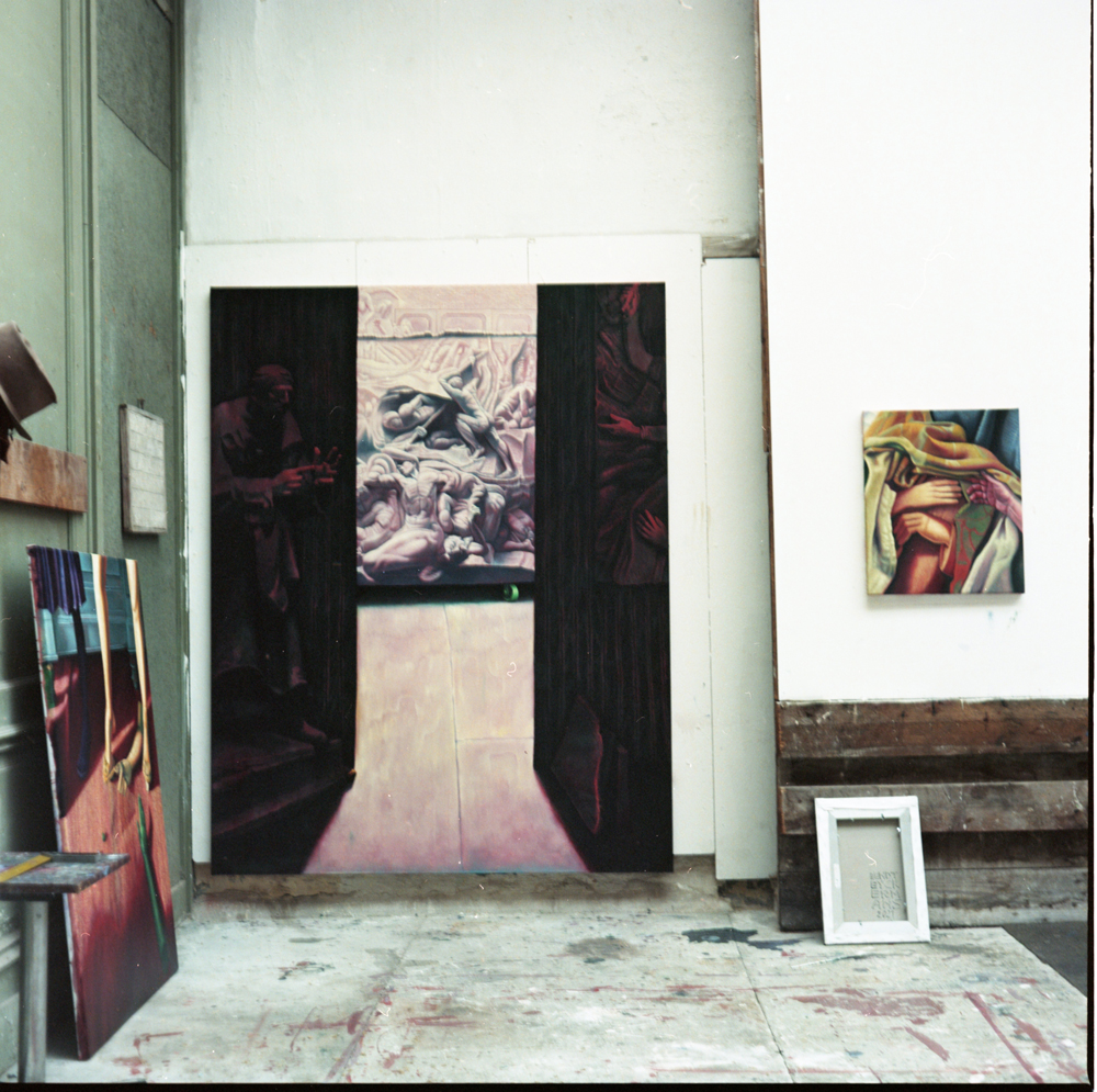 Het stopt nooit. Mijn beeldtaal is letterlijk mijn leven, leefwereld en naasten. Met elementen uit mijn leefwereld creëer ik ensceneringen waarvan ik foto’s neem. De foto’s zijn niet het eindbeeld. Ik heb altijd een camera op zak en bij zo goed als elk werk worden er elementen aan toegevoegd (en correcties) die ik haal uit een eigen archief van polaroids, films en tekeningen. Fotografie is dus een belangrijk element voor mij, als hulpmiddel om zaken te onthouden. Van deze foto’s worden dan tekeningen gemaakt en van deze tekeningen maak ik de schilderijen. De tekeningen hebben imperfecties en vervormingen die ik graag implementeer op doek. Fotografie is een dictator; ik gebruik het enkel als referentie voor hoe textiel bijvoorbeeld kreukt of valt. Het liefst kijk ik hier zo min mogelijk naar, de afbeelding staat zelfs niet in kleur. De ondertekening wordt geschilderd op doek met acryl inkten tot deze goed zit, en ik deze vervolgens kan uitwerken in olieverf.