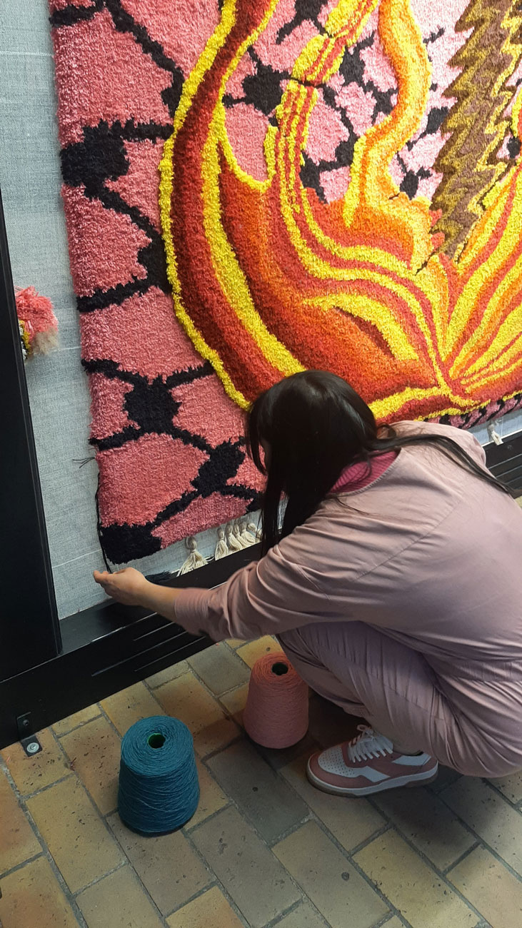 Onlangs heb ik in het Textiel Museum in Tilburg 40 grote wollen kwasten gedraaid die aan de onderkant van mijn wandkleed moeten komen. Deze heeft er de laatste vier maanden voor productie gehangen, het werd er namelijk met de hand getuft, dat is het met de hand maken van een hoogpolig tapijt. Dat er kwasten aan de onderkant moesten komen, was een last-minute besluit. Ik heb op YouTube gekeken hoe ik zo een kwast maak, en besloot om er op de allerlaatst mogelijke dag, dit nog snel ter plekke te maken. Om te werken op een openbare plek waar bezoekers komen en een gesprek met je aan gaan is leuk maar ook ingewikkeld, het was soms lastig om mij af te sluiten en zo raakte ik wel eens de tel kwijt of draaide ik scheve kwasten. Hiernaast was het ook een race tegen de klok, vlak na sluitingstijd was ik uiteindelijk toch klaar en had ik alle 40 kwasten af. Het kleed met de kwasten is vanaf deze week te zien in het Noord Brabants Museum.
