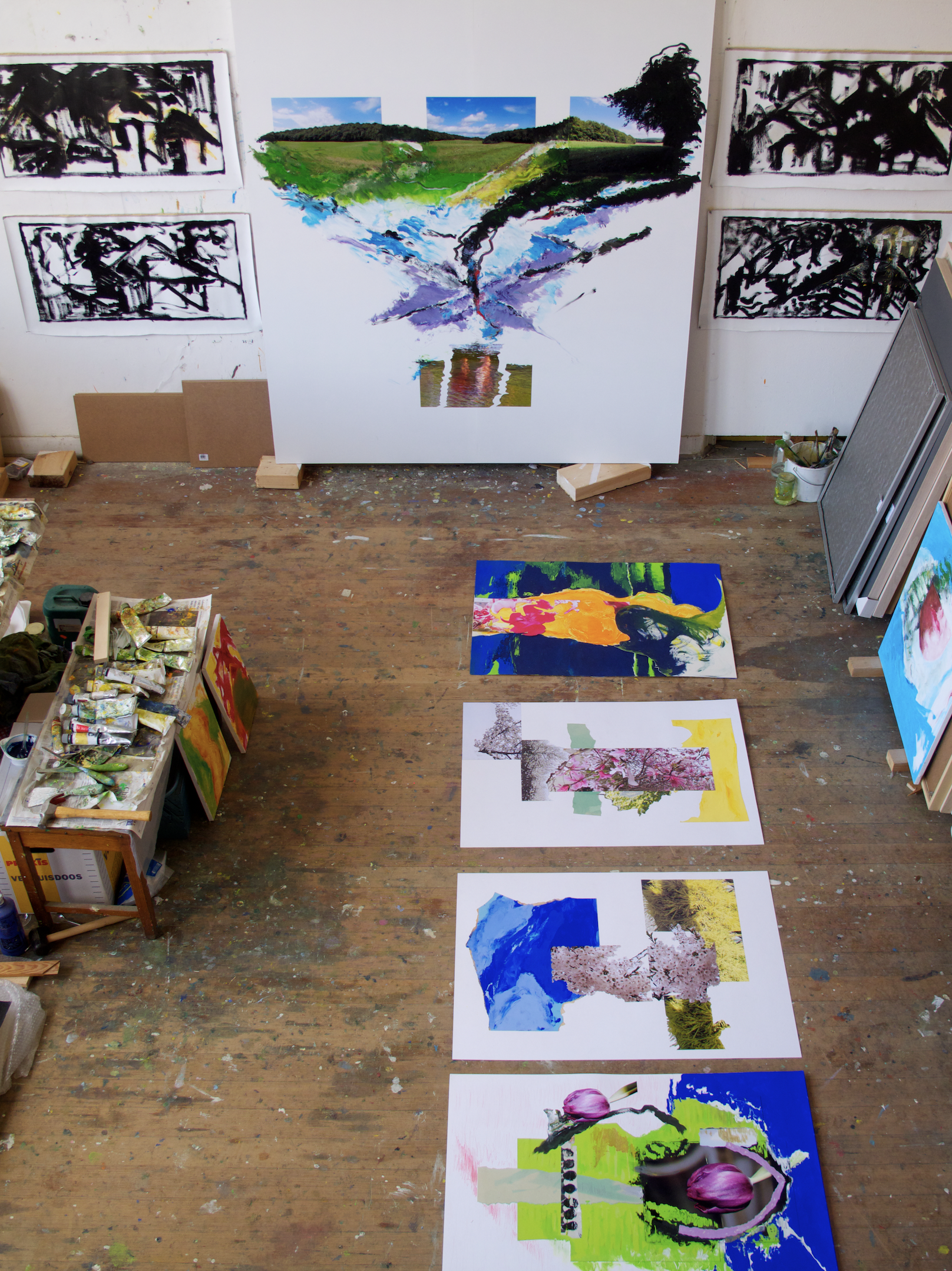 Het werk gaat altijd door. Ik denk er altijd aan. Als ik een nieuw schilderij opzet, begin ik schetsmatig met grote streken verf; de contouren van een landschap, zonder horizon. Ik werk ook regelmatig in de avond thuis. Als ik geschilderd heb, maak ik daar foto’s van die ik ’s avonds bestudeer. Ik kijk soms uren naar de foto’s, denk na over problemen in het beeld en probeer de volgende stap voor me te zien. Meestal, na heel lang kijken, komt een er een oplossing. Het kan het toevoegen van kleur zijn, het kan een schilderende handeling zijn. Ik probeer voor mijzelf een beeld te duiden om helderheid te krijgen over wat ik wil maken. Door deze handelingen ga ik vervreemding en tegenstellingen in het schilderij zien en dat inspireert me om verder te gaan. Eigenlijk ‘organiseer’ ik mijn hoofd door te kijken naar mijn schilderijen waar ik op dat moment aan werk. Ik zoek altijd naar een abstractie in het werk die helderheid geeft en een soort emotionele onderlaag vormt van wat ik ooit heb gezien of meegemaakt.