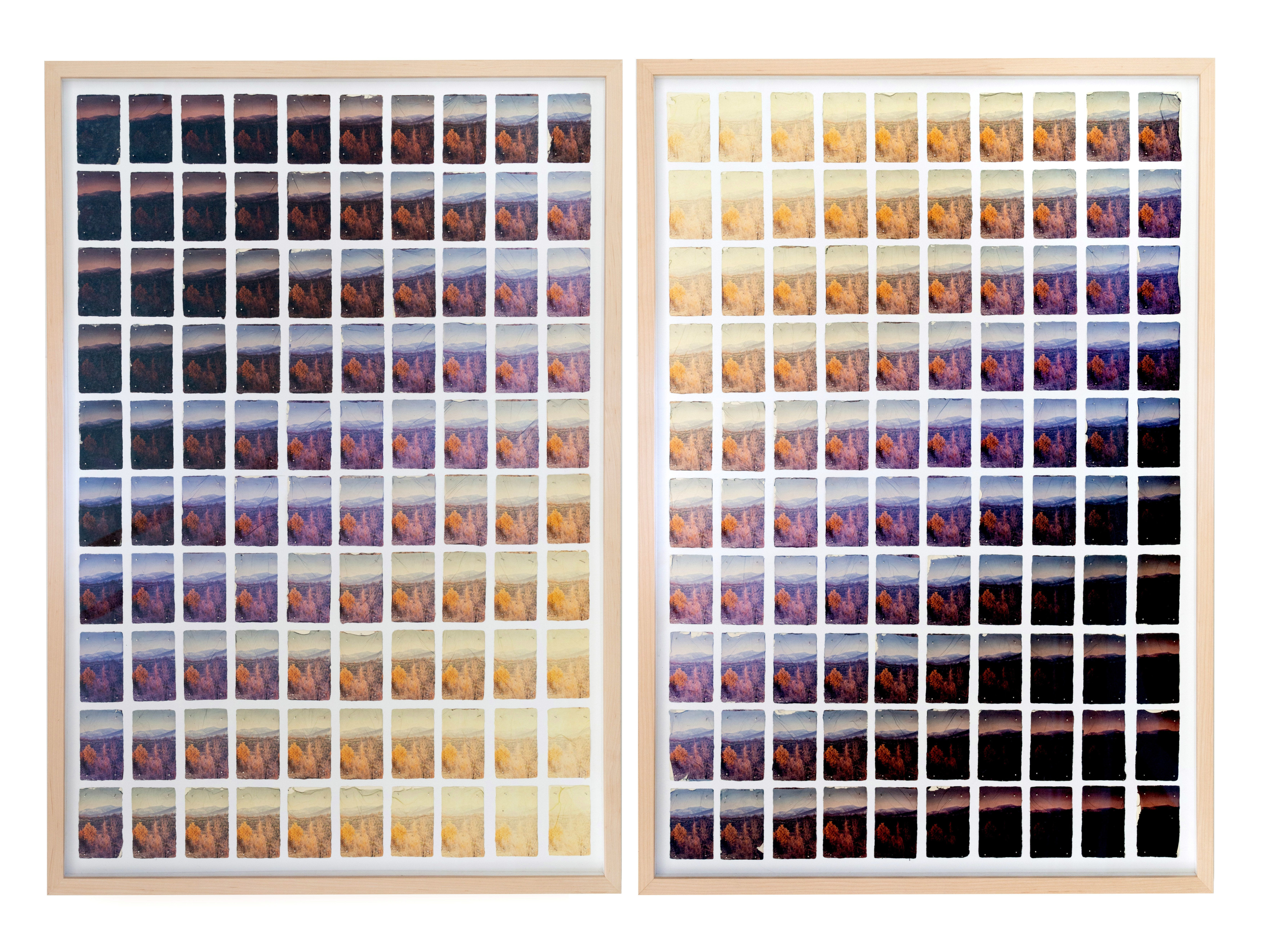 The deeply personal series "Exhilarating" by the Dutch photographer, film and documentary maker Joost Vandebrug is about light and positivity, but started in a dark period in the artist's life. In 2017, Vandebrug stayed in his house in rural France, where he tried to take control of his anxiety. He largely confined his living space to an old chaise longue next to the window, where he watched the days go from light to dark to light. It became a way of making it manageable, controllable. Each work in this series consists of a hundred small handmade prints depicting overwhelming mountain landscapes that were captured every day before sunset. Together, they form an overview of the visually magical transition period between light and dark. The hundred images are attached with pins to emphasize the fragility of the process. For the photographer, the work symbolises the happy resignation to the idea that darkness can and will always rear its head, but that it is unmistakably linked to the light.