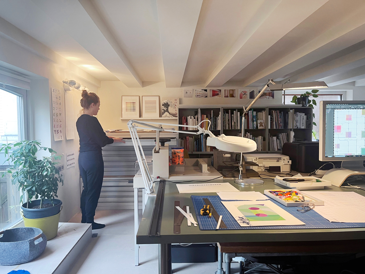 Wat ik persoonlijk fijn vind van een vaste plek is dat ik omringd ben met mijn boeken waar ik graag in kijk, en al mijn eigen uitprobeersels en schetsen om mij heen. Maar ook de praktische spullen, zoals mijn grote werktafel, mijn printer, papiersnijmachine en andere materialen. Het is fijn om alles bij de hand te hebben. Als je iets wil maken, heb je de materialen bij de hand om het uit proberen. De plek geeft me veel rust, en het belangrijkste is dat ik echt in mijn eigen wereld ben – de buitenwereld telt even helemaal niet mee, en dat is eigenlijk het heiligste moment.
