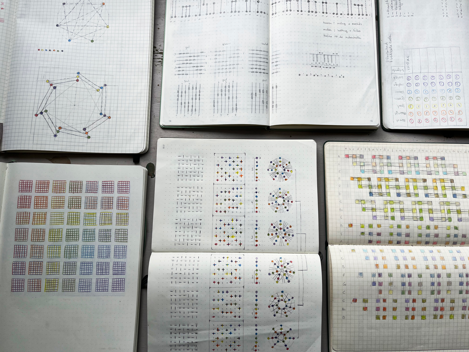 Als ik meer praktisch bezig ben, zoals bij het maken van boeken, het printen en rillen van de papieren, of bij het recente werk ‘Duetten en Ensemble in kleur’ waar ik weef met draad op papier, kan ik het soms wel fijn vinden om naar muziek te luisteren. Vaak pianomuziek, zoals de ‘Canto Ostinato’ van Simeon ten Holt, muziek waar een herhalende cadans inzit. Dat is een prettige combinatie met mijn werk. En als ik meer energie nodig heb, laat ik me wel opzwepen door Dancehall. De Podcasts die ik graag beluister zijn ‘Springvossen’, ‘Onbehaarde apen’ en ‘Future Affairs’. Het moet niet te veel afleiden, ik moet wel op kunnen blijven letten. Maar meestal wil ik juist tijdens deze repeterende handelingen stilte, omdat ik dan op nieuwe ideeën kom. Als ik echt de concentratie nodig heb zoals bij het onderzoek, het ontwerpen en uitproberen van de dingen, wil ik juist stilte om me goed te kunnen focussen, dan leiden alle geluiden juist af.