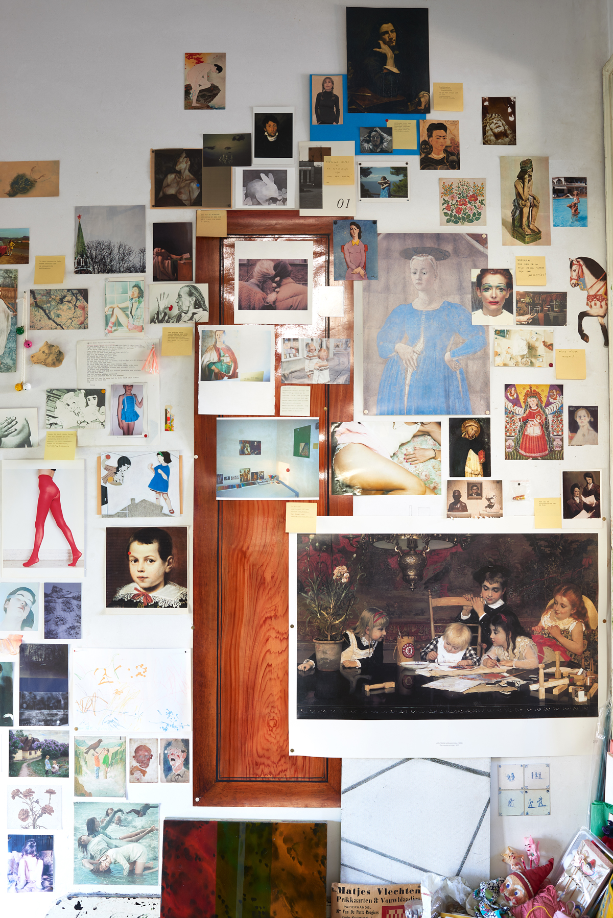 Zie het als een soort van kabinet vol met referentiebeelden. Prikkels die me voeden en inspireren. Maar bovenal zijn het verhalen, herinneringen, kronkels die een houvast bieden. Een soort van anker, een ruggengraat. Ik ben erg visueel en ik maak verhalen met beelden. In het atelier heerst er meer rust. Er hangt minder aan de muren. Toch heb ik ook op die plek de behoefte om mezelf te overladen met beelden. Daar spelen kunstboeken een grote rol. Ik vind het inspirerend om boeken open te leggen.