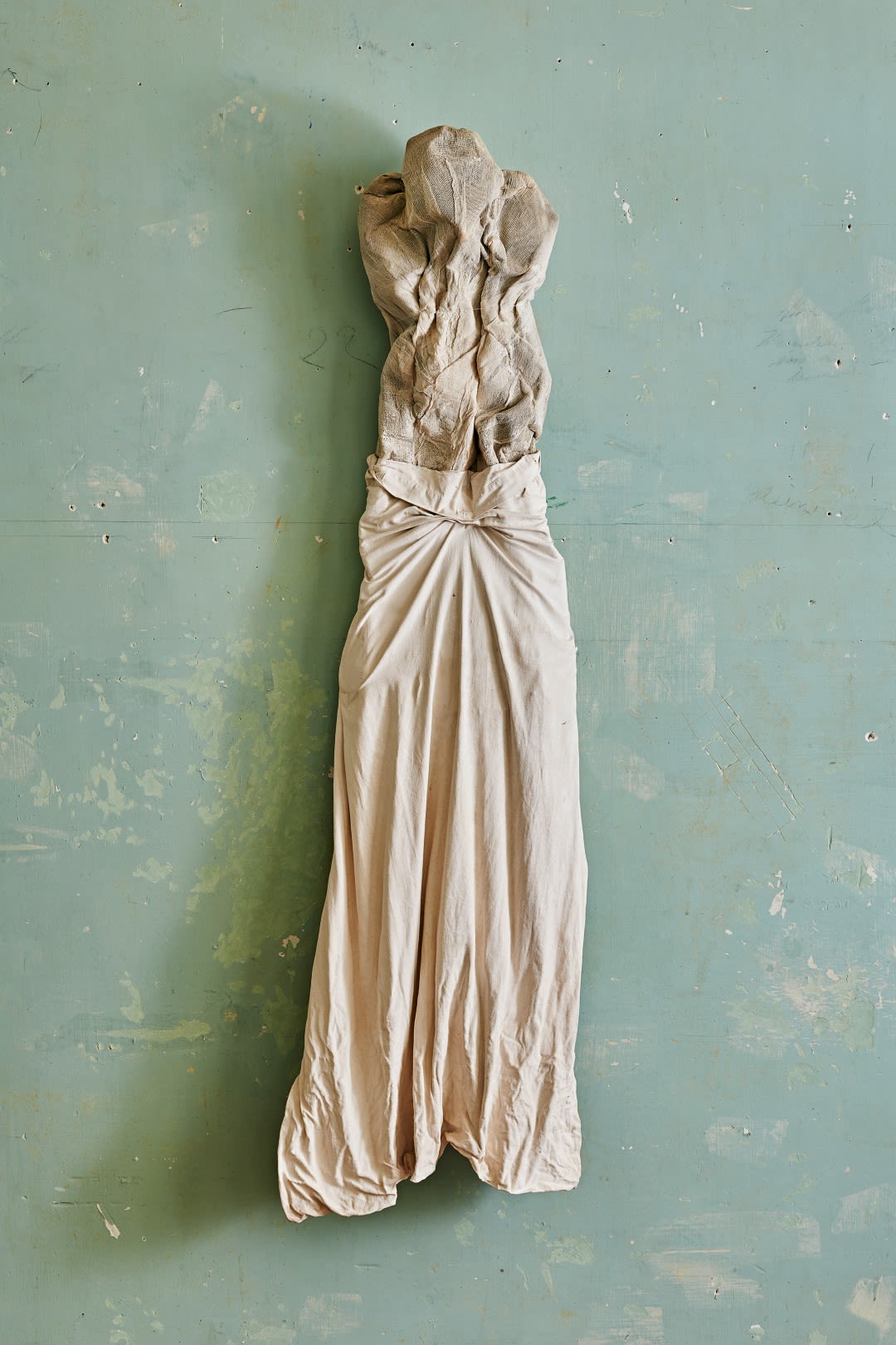 The tube figures are visible in collages, drawings and sculptures that are often marked by unconventional materials, offering them a new context. Despite the fact that they usually lack a head and arms, the distorted figures are unmistakably human. Memories and death play an important role in this. The melancholy figures undergo an evolution in his practice, for instance in the form of paper, canvas and pigment, but the tube shape forms a significant basis for this. This evolution is clearly visible in the top image that is shown here.