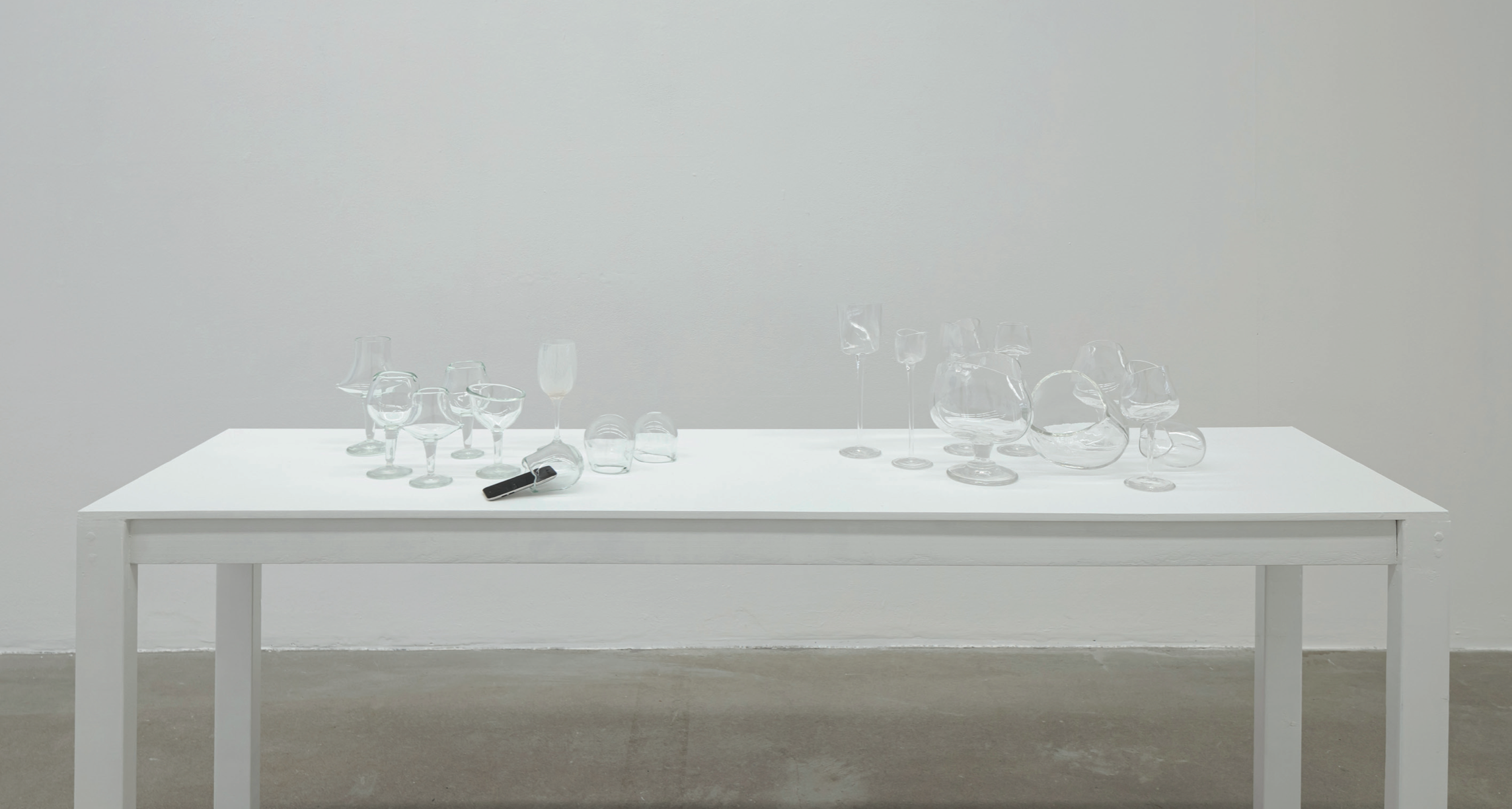 In the exhibition at AKINCI, you can see two versions of the installation "Jingle" (2012 and 2021) by Cevdet Erek, which consists of a table with eight or nine hand-blown glasses each — one of which contains remnants of the Turkish drink ayran —, an iPod and a series of associative sounds. The shape of the glasses in the latest version refers to cow and sheep bells and in the sound you can hear the artist tapping against glass as well as goats in the distance. Together, they evoke an association of landscapes full of cattle. The 2012 version was shown at Palais de Tokyo in Paris, among others.