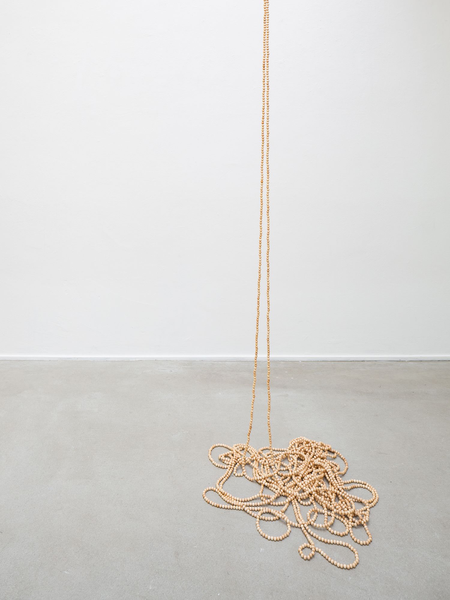 Stéphanie Saadé shows several works including "Building a Home with Time" (2019), which consists of a long beaded string with 2832 beads, which refers to the number of days between the artist's birth and the end of the Lebanese Civil War. In addition, you can see her work "Family Circle" (2022), a canvas with three hairs connected in a circle: the hair of the artist in connection with that of her mother and her daughter, three generations.