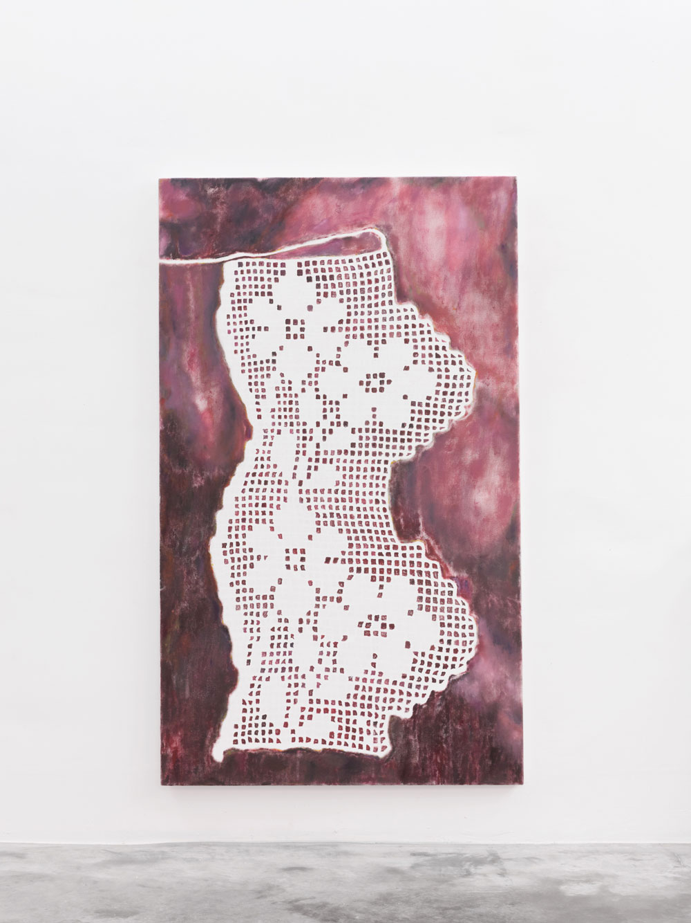Terug in Amsterdam ging Raven opzoek naar afbeeldingen van haakwerk en kwam op een Oost-Europese Marktplaats voor patronen terecht. “Sommige beelden trof ik zo aan online, die heb ik uitgesneden en als inspiratie gebruikt. Het kostte veel tijd om de schilderijen te maken omdat ik moest uitvinden hoe ik ze moest schilderen, dit is ook een belangrijk onderdeel van mijn praktijk, om continu in beweging te blijven en nieuwe thema’s aan te snijden en te ontdekken. Innovatie in het werk is essentieel.”