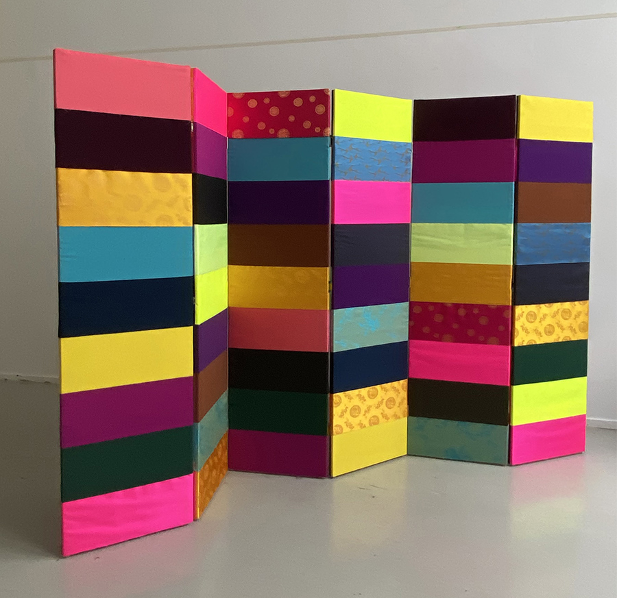 Galerie Maurits van de Laar opent het seizoen met de solo tentoonstelling ‘The Intuition’ van Fransje Killaars (1959) met werk op papier, kamerschermen, doeken en installaties. Killaars maakt ruimtelijke installaties waar kunst, design, architectuur en mode samenkomen. Doordat Killaars gebruik maakt van textiel, voelt de toeschouwer zich omhuld en ondergedompeld in de werking van kleur. Haar kunst heeft een autonome kwaliteit maar raakt ook aan politieke thema’s die er subtiel mee verweven zijn. Zoals Image of Power (2023) dat geïnspireerd is op het thema mensenrechten en het recht op vrijheid in het bijzonder.